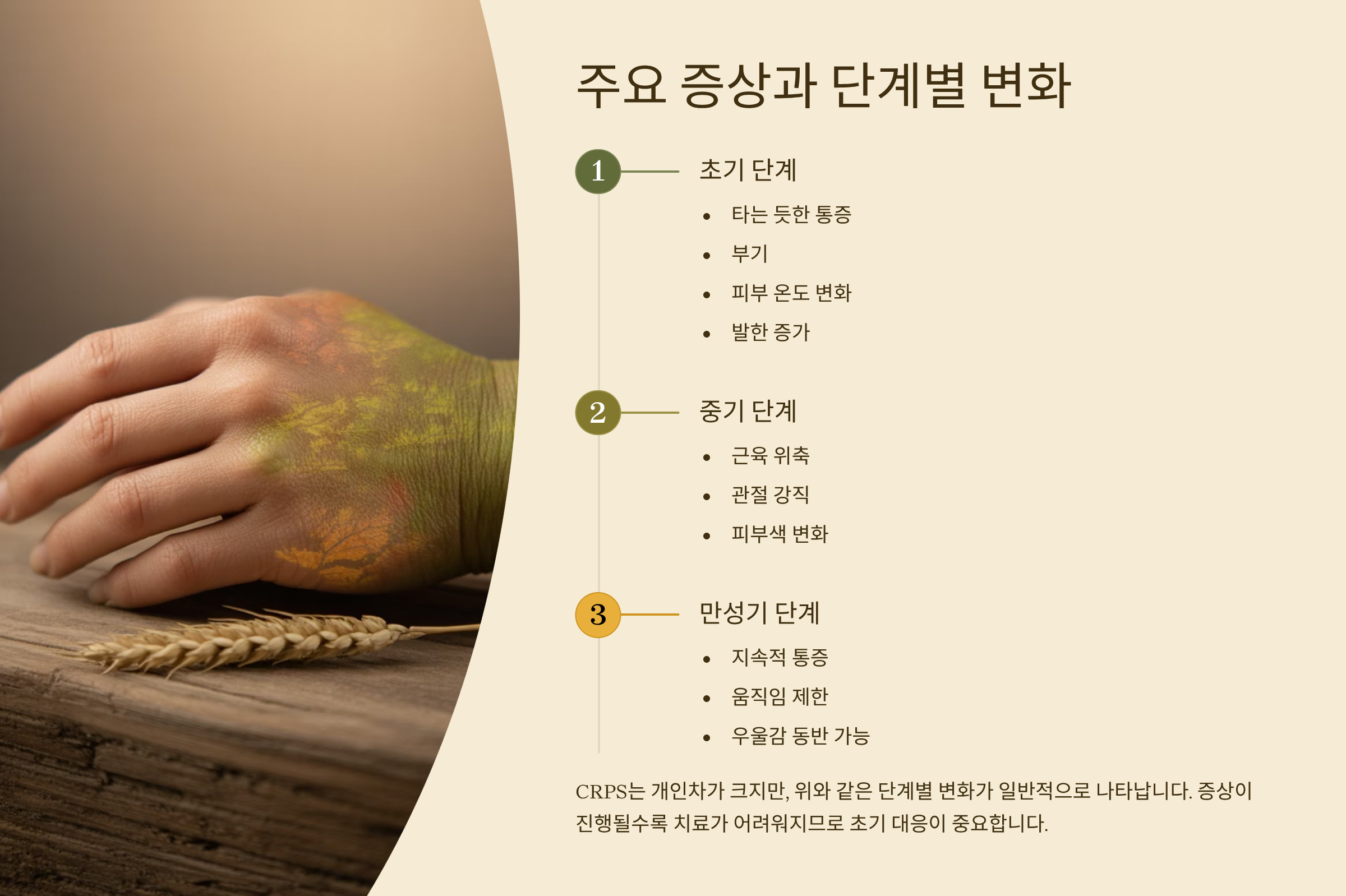 CRPS는 초기 단계에서부터 만성화 단계까지 증상이 변화하며 진행됩니다. 증상은 개인차가 크지만, 아래와 같은 변화가 일반적이에요.