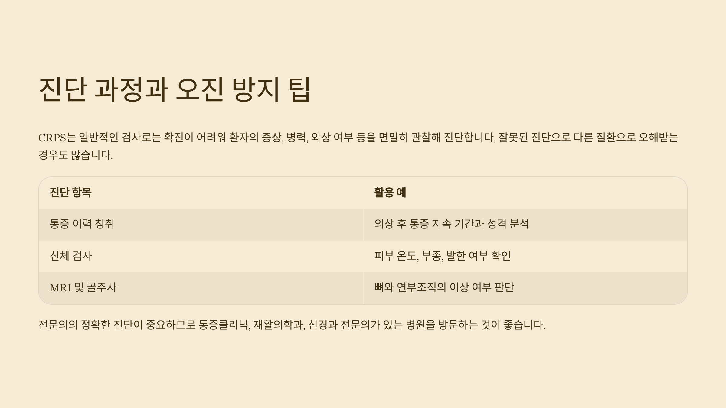 CRPS는 일반적인 검사로는 확진이 어려워요. 따라서 환자의 증상, 병력, 외상 여부 등을 면밀히 관찰해 진단하게 되며, 잘못된 진단으로 다른 질환으로 오해받는 경우도 많습니다. 전문가들은 다음과 같은 조합으로 진단을 내려요.