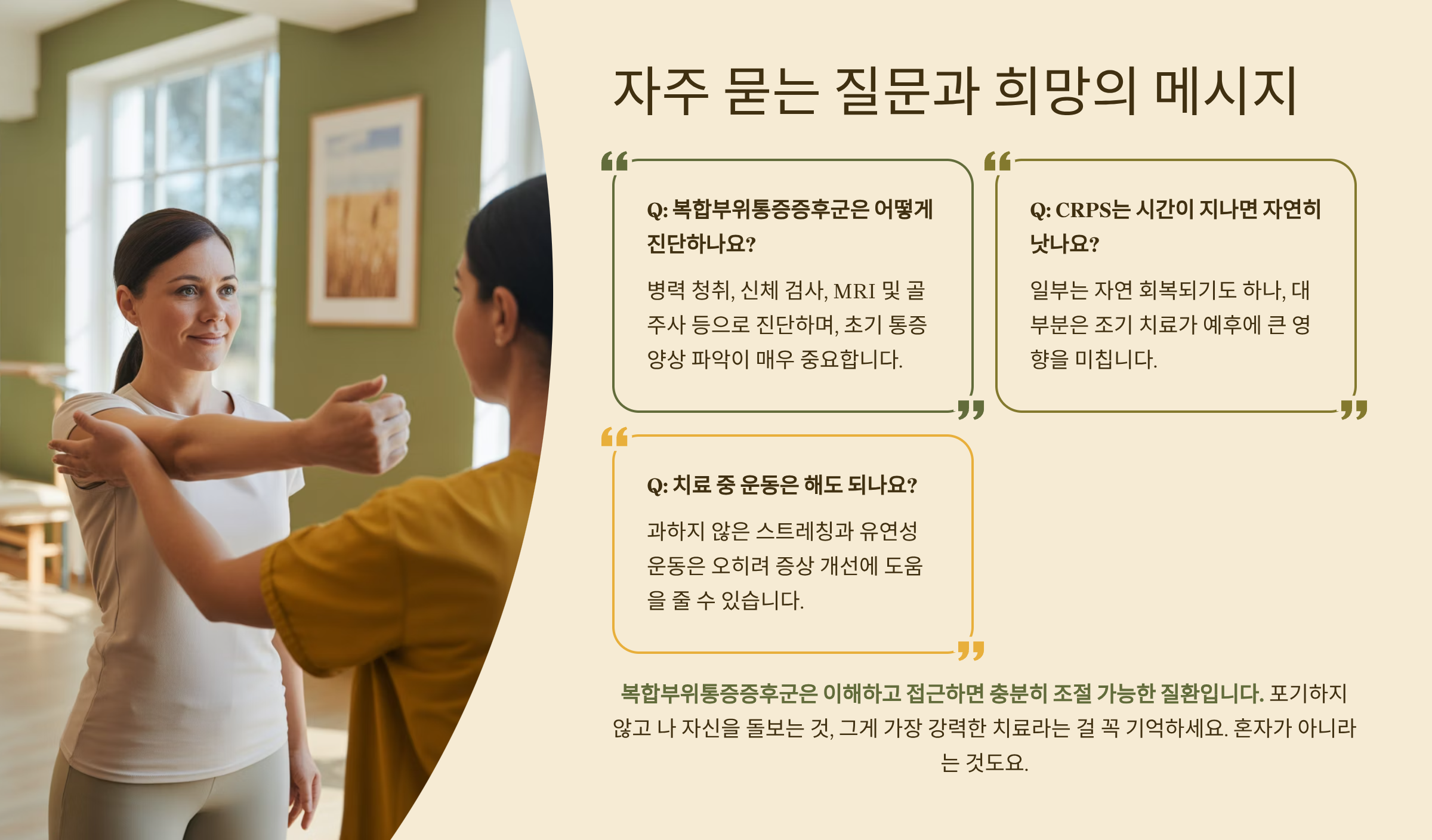 복합부위통증증후군은 듣기만 해도 복잡하고 무서운 질환처럼 느껴질 수 있지만, 이해하고 접근하면 충분히 조절 가능한 질환입니다. 저도 처음엔 이유 모를 통증에 매일이 지옥 같았지만, 다양한 치료와 따뜻한 지지 덕분에 삶의 질을 조금씩 회복해나가고 있어요. 지금 이 글을 보고 계신 당신도 그 여정의 시작점에 있을지도 모르겠네요. 포기하지 않고 나 자신을 돌보는 것, 그게 가장 강력한 치료라는 걸 꼭 기억하세요. 혼자가 아니라는 것도요.