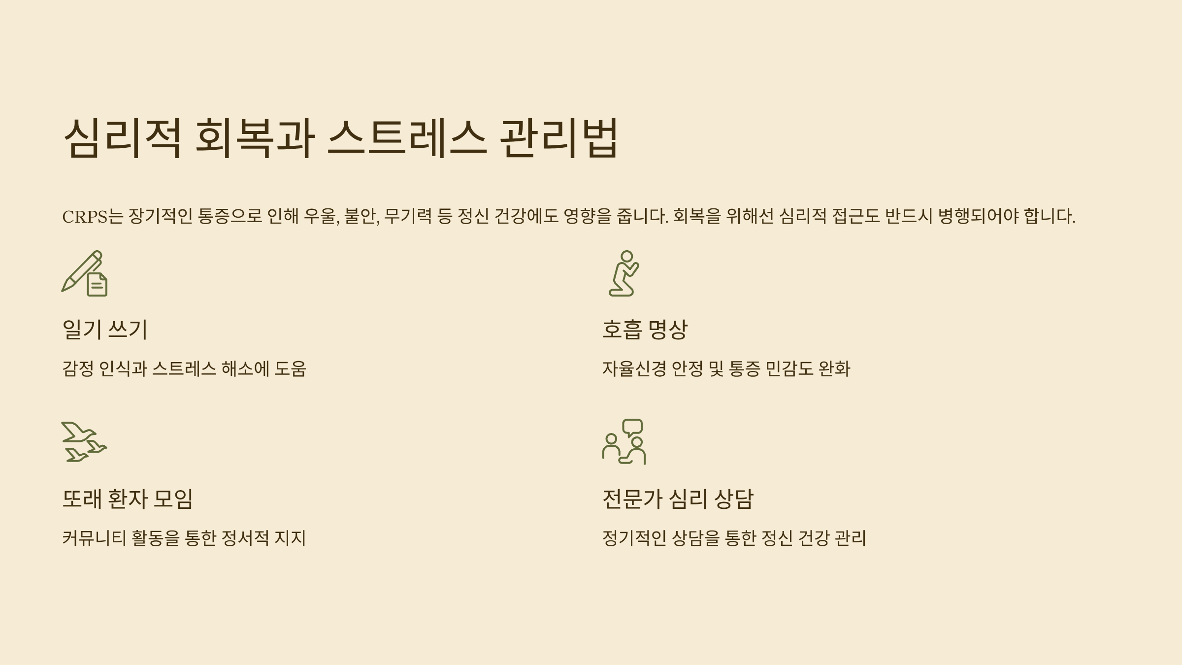 CRPS는 장기적인 통증으로 인해 우울, 불안, 무기력 등 정신 건강에도 영향을 줍니다. 회복을 위해선 심리적 접근도 반드시 병행되어야 합니다. 다음은 환자들이 직접 실천하며 도움을 받은 회복 전략입니다.