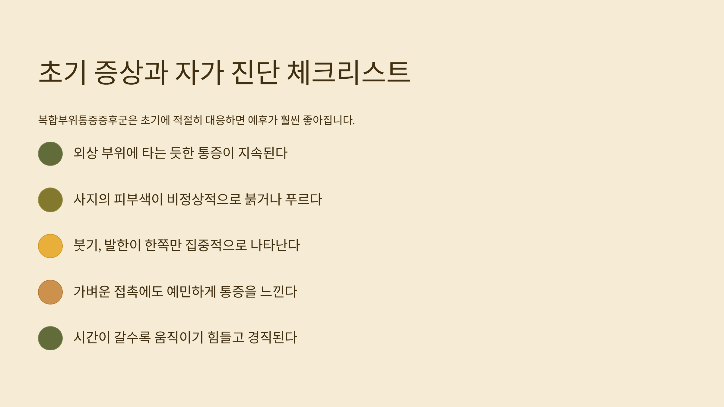 복합부위통증증후군은 초기에 적절히 대응하면 예후가 훨씬 좋아집니다. 다음은 의심해볼 수 있는 초기 증상과 자가 진단 체크리스트입니다.