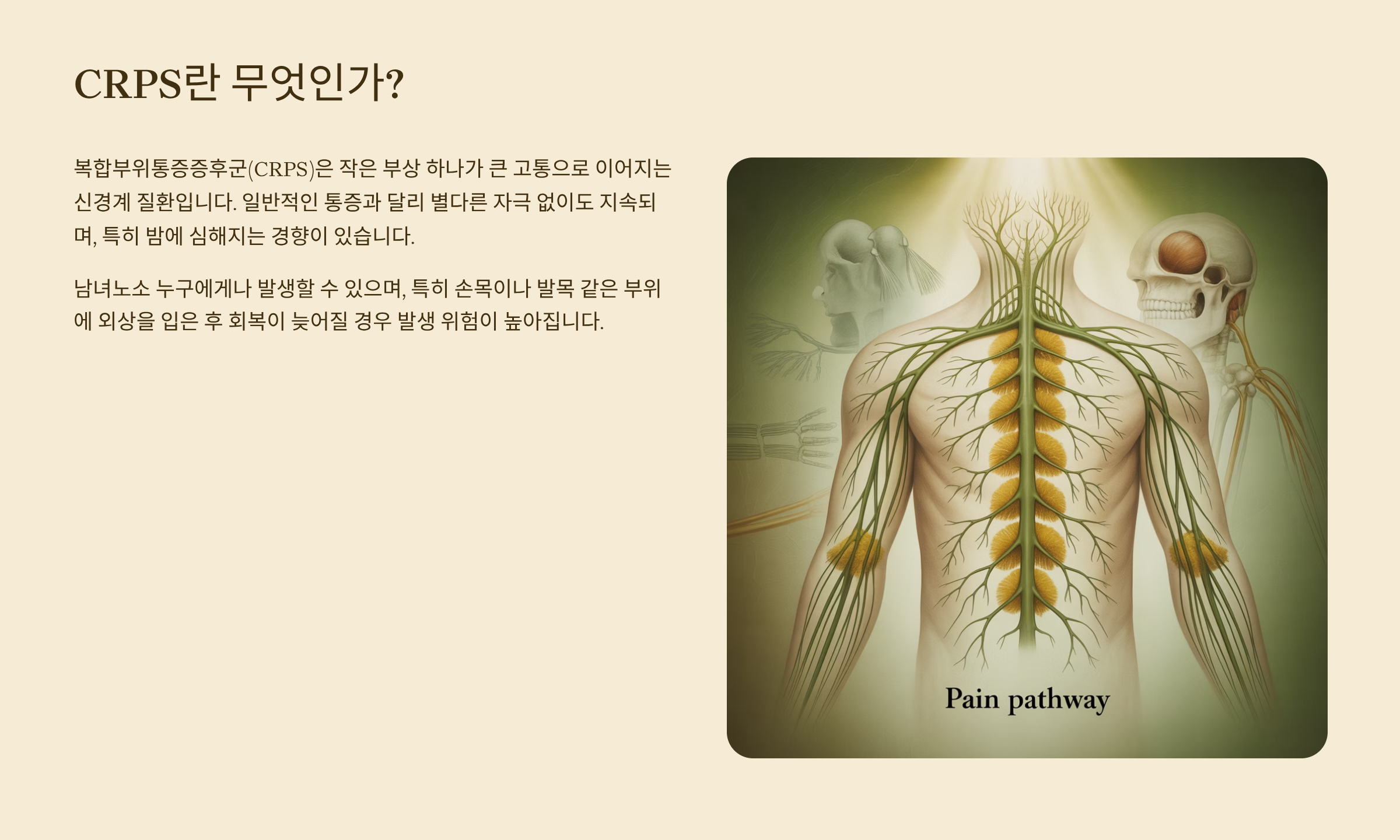 | 합부위통증증후군(CRPS): 보이지 않는 고통의 실체 (1) | 2025.09.01 |