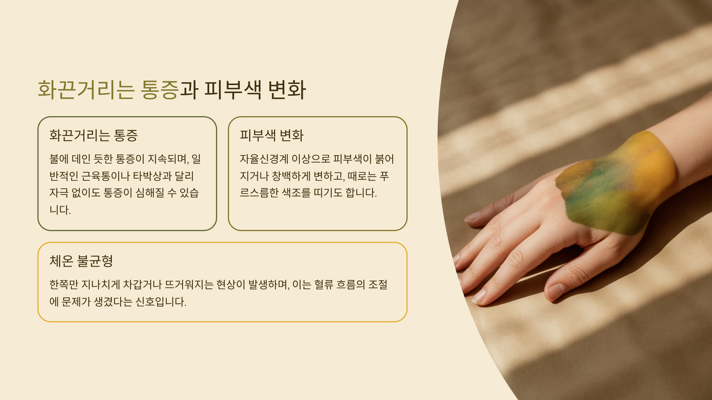 CRPS 부위에서는 자율신경계의 이상 반응으로 인해 피부색이 붉어지거나 창백하게 변하고, 때로는 푸르스름한 색조를 띠기도 해요. 체온도 불규칙해져서 손이나 발이 지나치게 차거나 뜨거워지는 경우가 잦습니다. 이는 혈류 흐름의 조절에 문제가 생겼다는 신호로 볼 수 있어요.