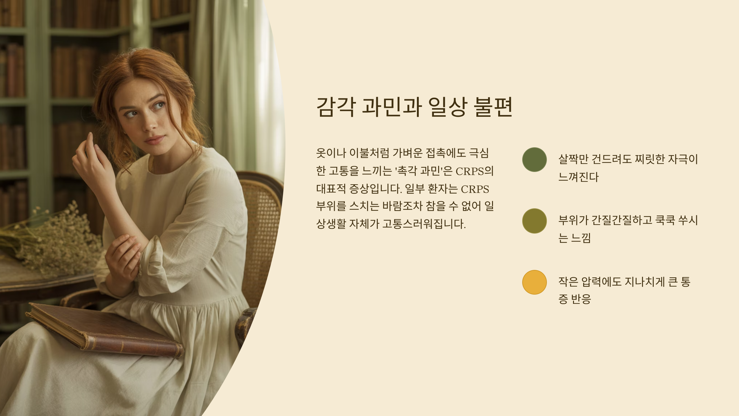 옷이나 이불처럼 가벼운 접촉에도 극심한 고통을 느끼는 증상, 바로 ‘촉각 과민’입니다. 일부 환자는 CRPS 부위를 스치는 바람조차 참을 수 없어 일상생활 자체가 고통스러워지죠. 통증 때문에 옷을 입는 것조차 부담스럽다는 이야기도 들려요.