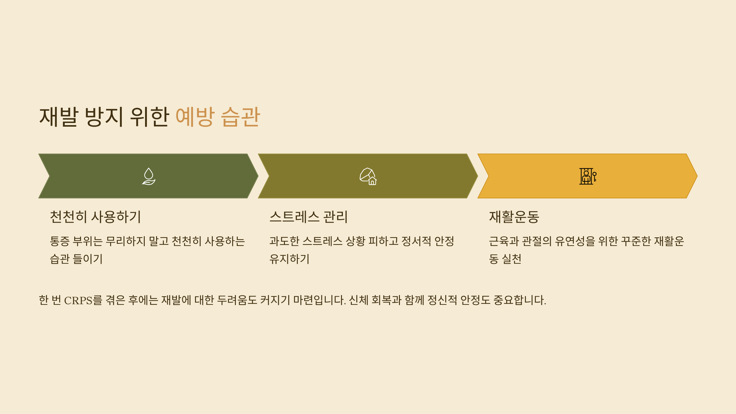 한 번 CRPS를 겪은 후에는 재발에 대한 두려움도 커지기 마련이에요. 신체 회복과 함께 정신적 안정도 중요하답니다. 아래는 일상에서 실천 가능한 예방법이에요.