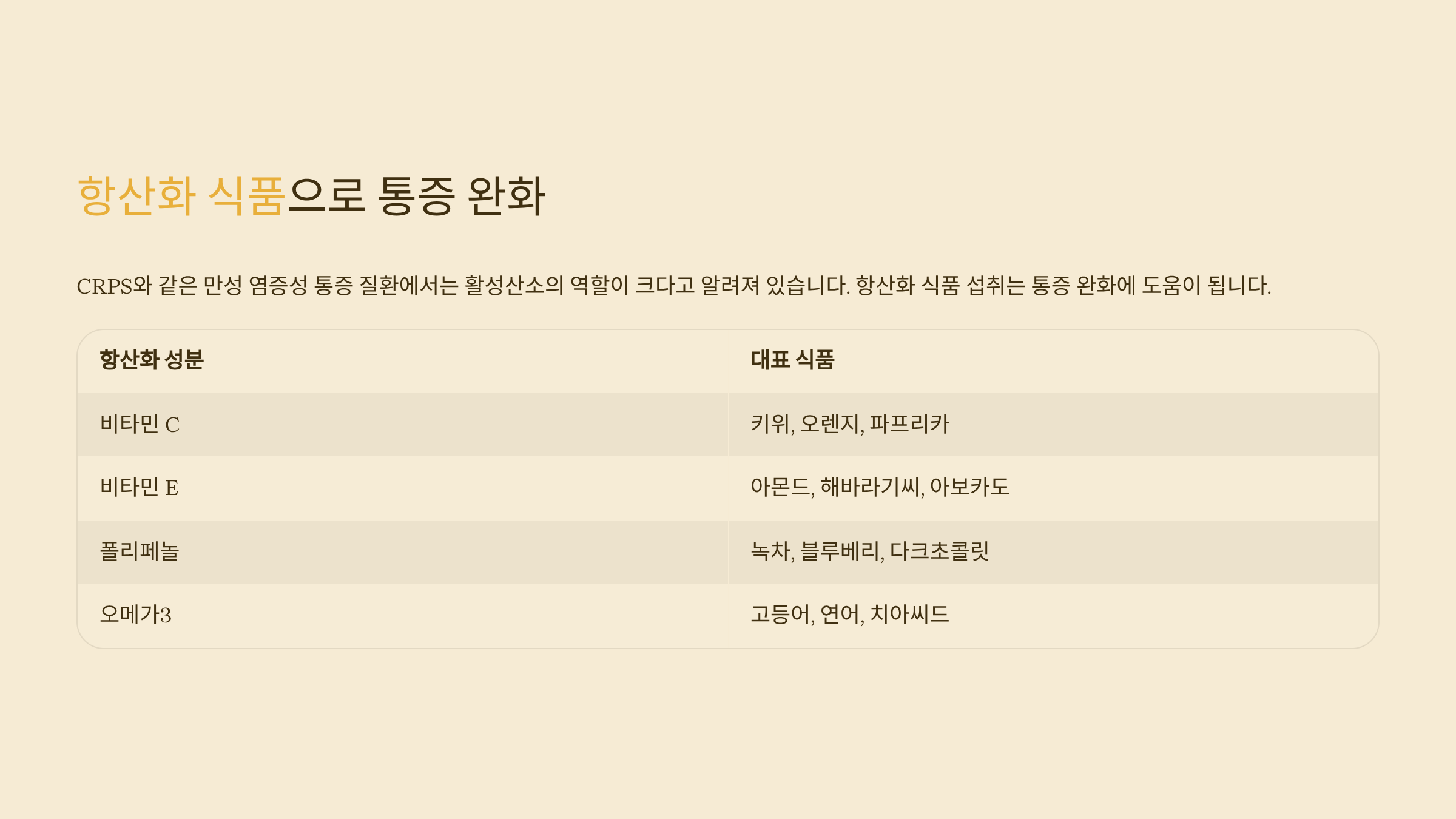 CRPS와 같은 만성 염증성 통증 질환에서는 활성산소의 역할이 크다고 알려져 있어요. 이 때문에 항산화 식품 섭취는 통증 완화에 도움이 됩니다. 비타민 C, 비타민 E, 폴리페놀, 오메가3 지방산이 풍부한 식품을 꾸준히 섭취해보세요.
