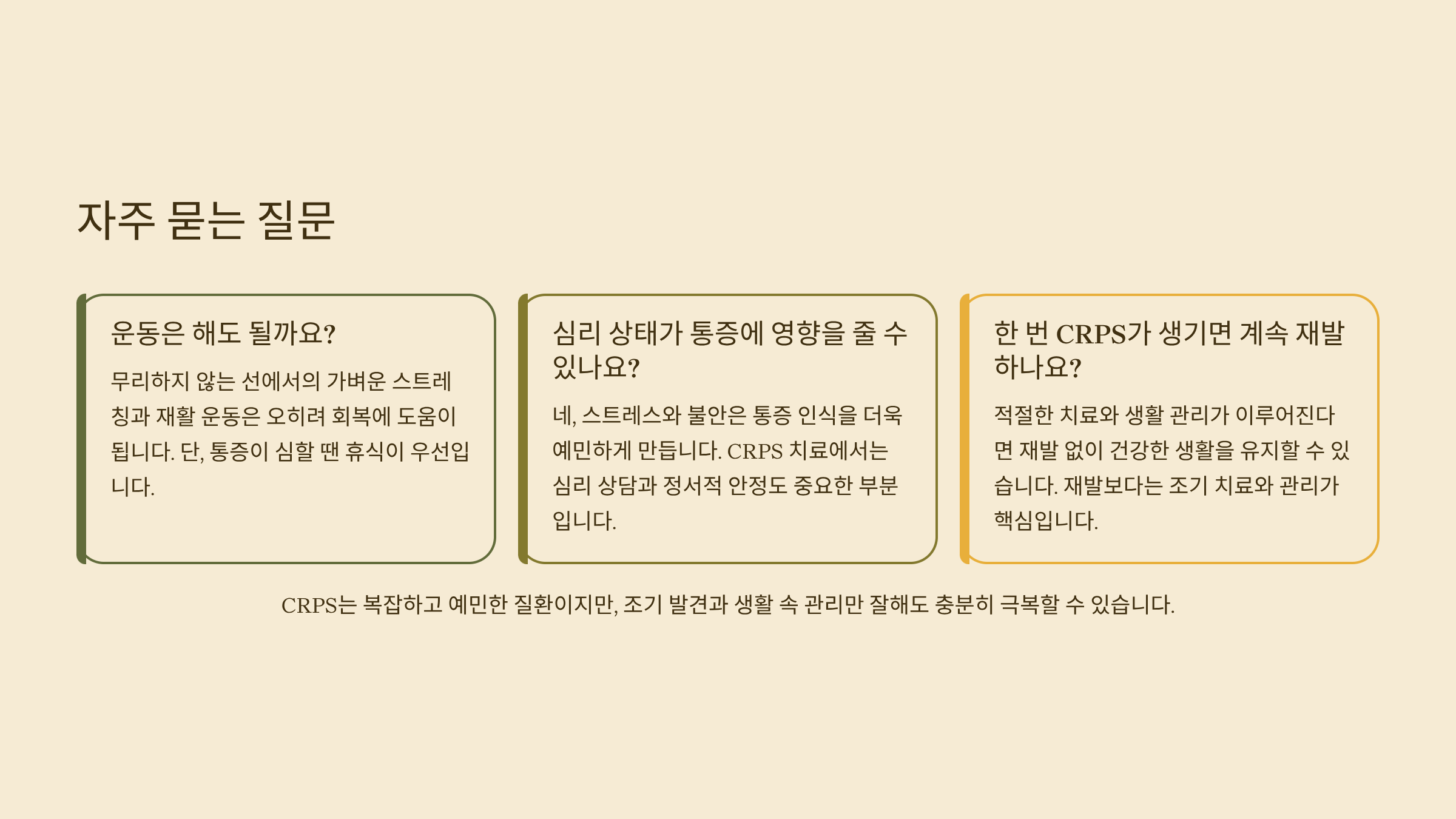 CRPS는 단순히 ‘통증’이라는 단어로 설명되기엔 너무나 복잡하고 예민한 질환입니다. 하지만 조기 발견과 생활 속 관리만 잘해도 충분히 극복의 길로 나아갈 수 있어요. 이 글을 통해 조금이라도 증상을 의심하고, 예방의 계기를 삼으셨다면 큰 의미가 있다고 생각해요. 앞으로도 여러분의 통증 없는 삶을 응원할게요. 힘내세요!