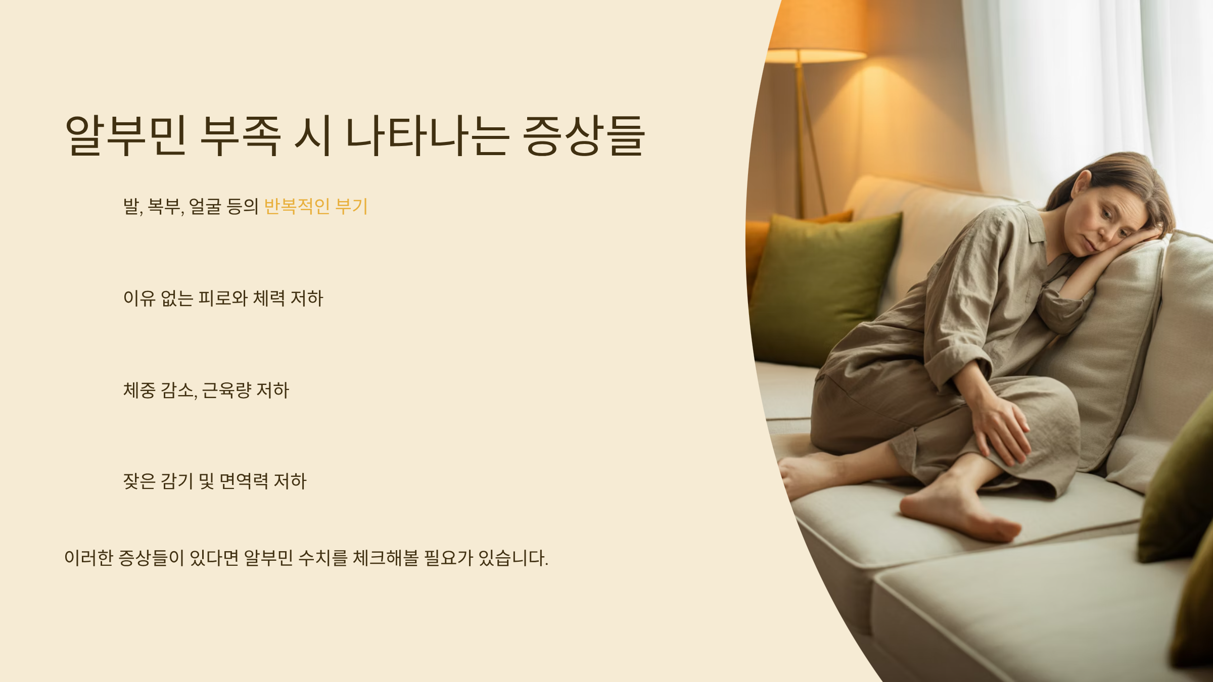 알부민이 부족하면 우리 몸은 다양한 경고 신호를 보냅니다. 다음과 같은 증상들이 있다면 알부민 수치를 체크해볼 필요가 있어요.