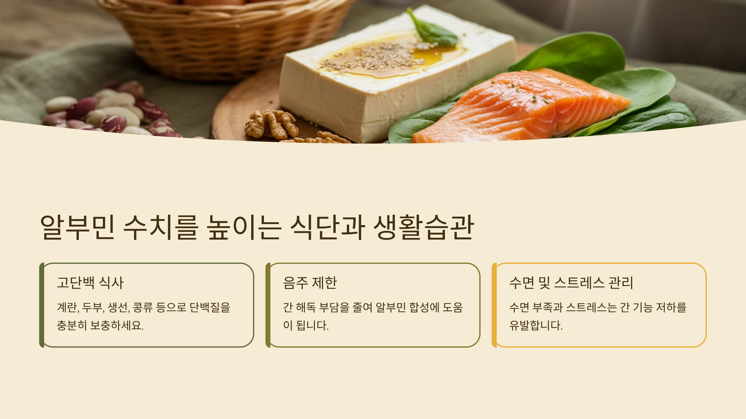 | 음주 제한 | 간 해독 부담을 줄여 알부민 합성에 도움 |