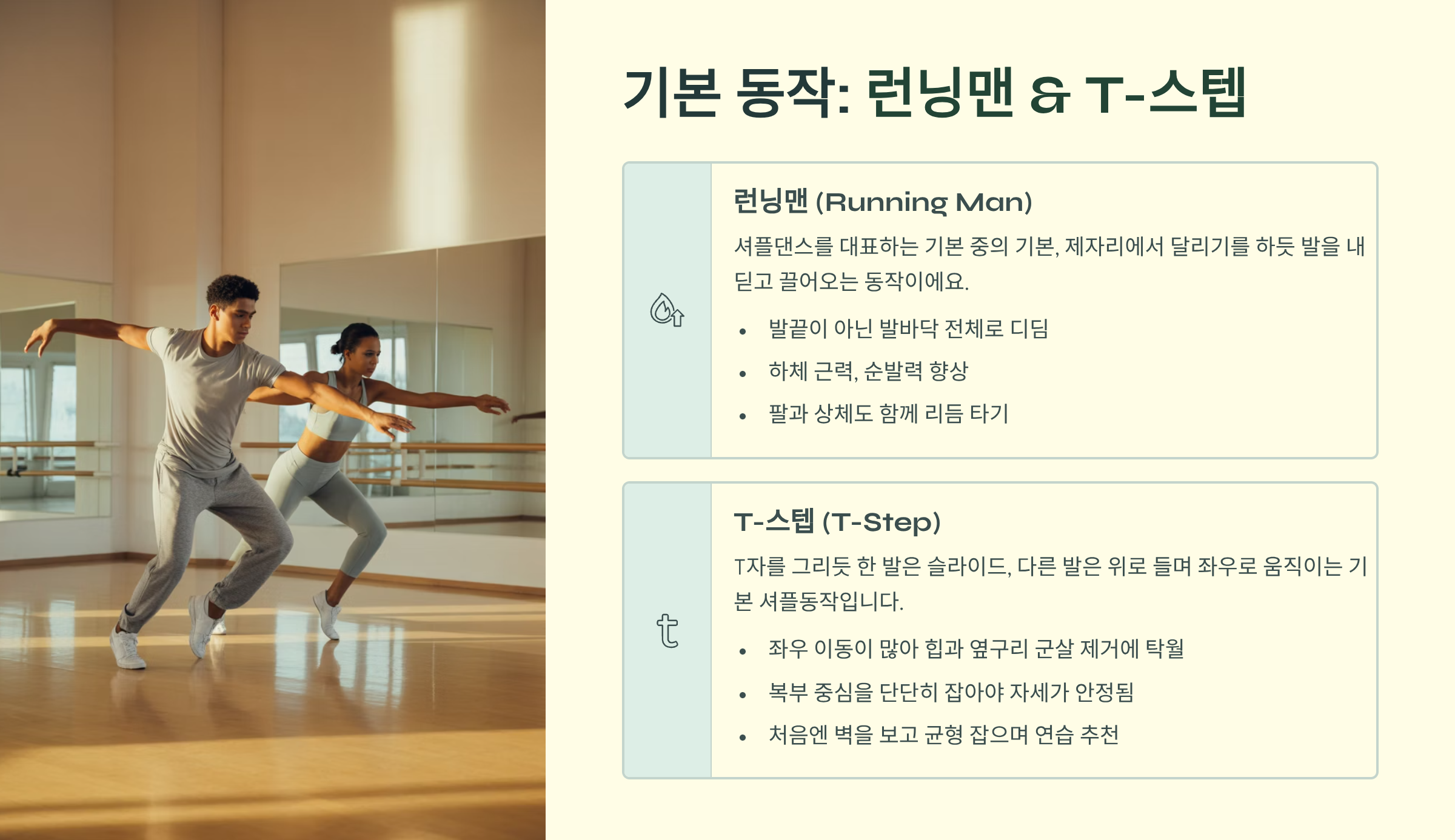 T자를 그리듯 한 발은 슬라이드, 다른 발은 위로 들며 좌우로 움직이는 기본 셔플동작입니다. 복부, 허리의 중심을 잡는 코어 근육을 많이 사용하게 되고, 리듬과 균형 잡는 능력을 크게 향상시켜요. 무릎을 너무 꺾지 않고, 가볍게 미끄러지듯 움직이면 부드럽고 멋진 동작이 완성됩니다.