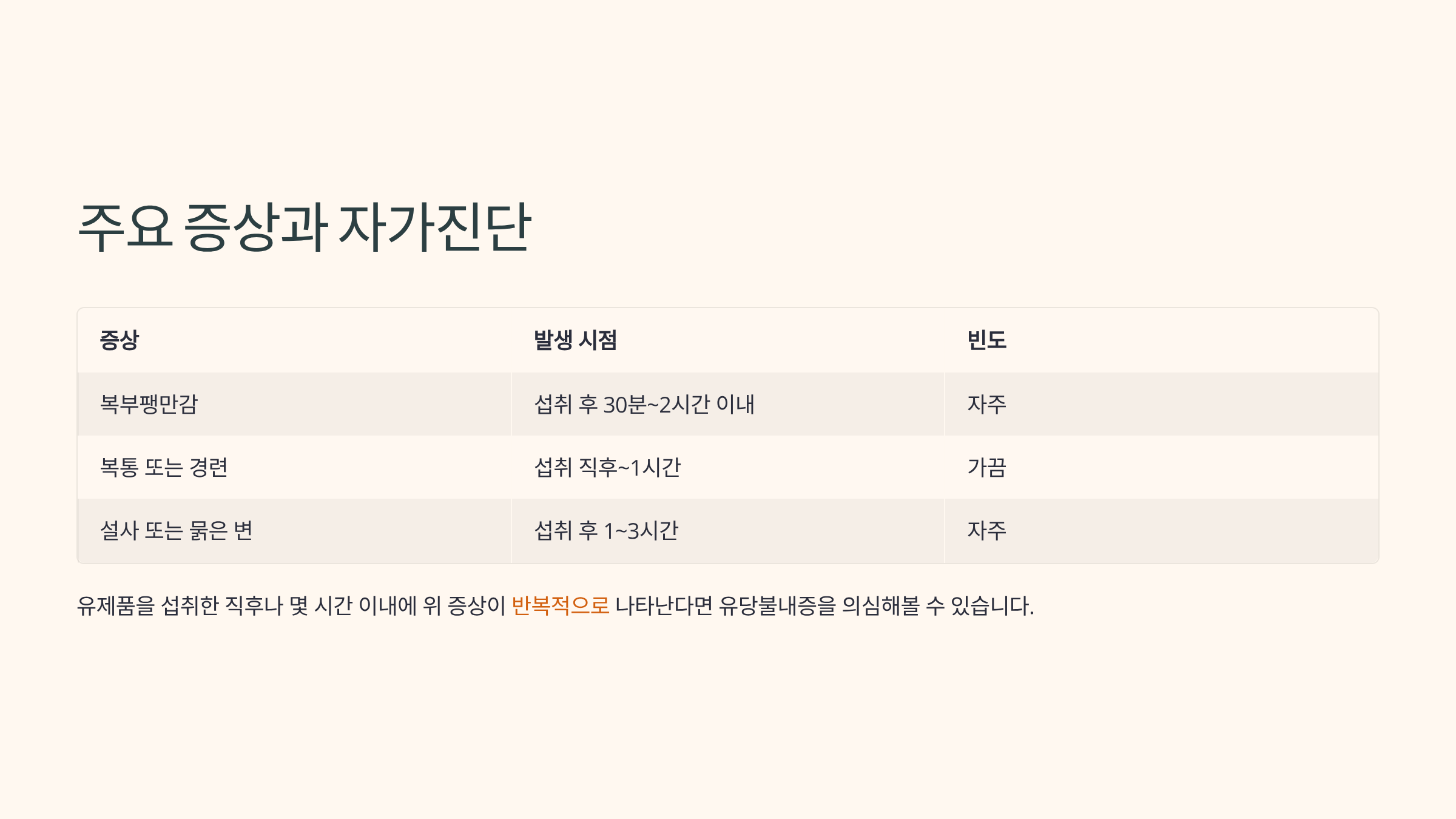 | 설사 또는 묽은 변 | 섭취 후 1~3시간 | 자주 |