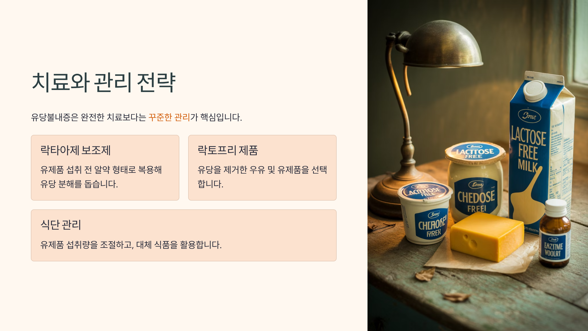 | 식단 관리 | 유제품 섭취량을 조절하고, 대체 식품 활용 |