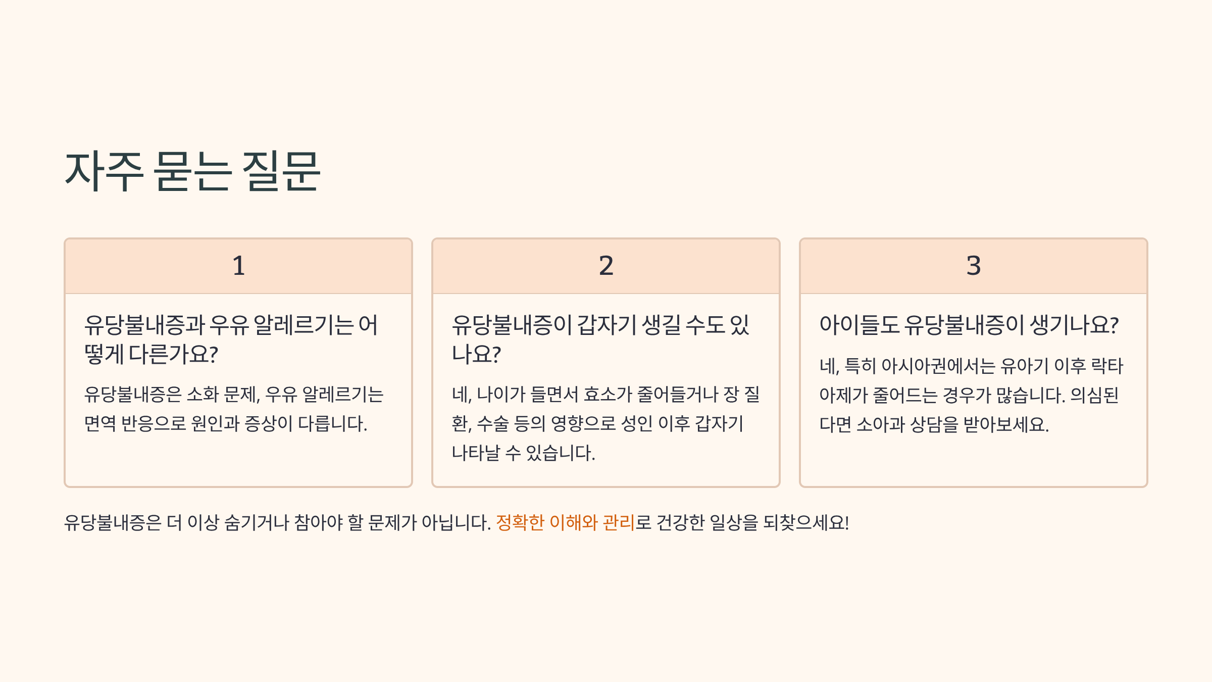 우유 한 잔 때문에 하루 종일 속이 뒤틀린 적이 있으신가요? 저도 그랬어요. 하지만 유당불내증이라는 걸 알고 나서부터는 정말 많은 게 달라졌습니다. 중요한 건 증상을 정확히 이해하고, 자신에게 맞는 관리 방법을 찾는 거예요. 유당불내증은 더 이상 숨기거나 참아야 할 문제가 아니에요. 여러분도 이 글을 참고해서 당당하게 자신을 챙기시길 바랍니다. 궁금한 점이나 경험담이 있다면 댓글로 나눠주세요! 함께 나누면 더 편해질 수 있어요.