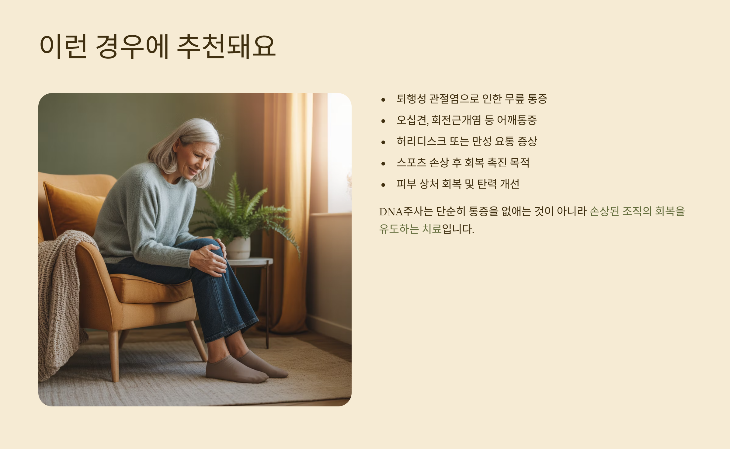 DNA주사는 단순히 통증을 없애는 진통제가 아니에요. 회복을 유도하는 치료이기 때문에 다음과 같은 상황에서 추천됩니다.
