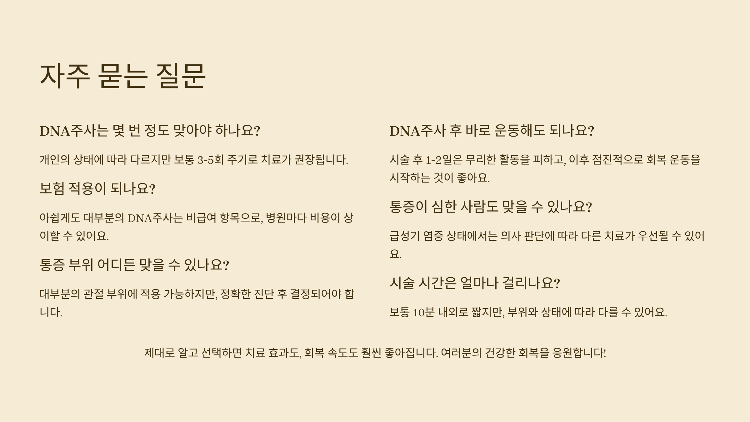 오늘은 DNA주사에 대해 하나부터 열까지 정리해보았어요. 병원에서 추천하더라도 ‘이게 내 몸에 맞는 치료일까?’ 고민이 드는 건 당연하죠. 제대로 알고 선택하면 치료 효과도, 회복 속도도 훨씬 좋아지니까요. 혹시 시술 경험이 있으시거나 궁금한 점이 있다면 댓글로 공유해 주세요. 여러분의 이야기가 또 다른 누군가에게 큰 도움이 될 수 있답니다 :)