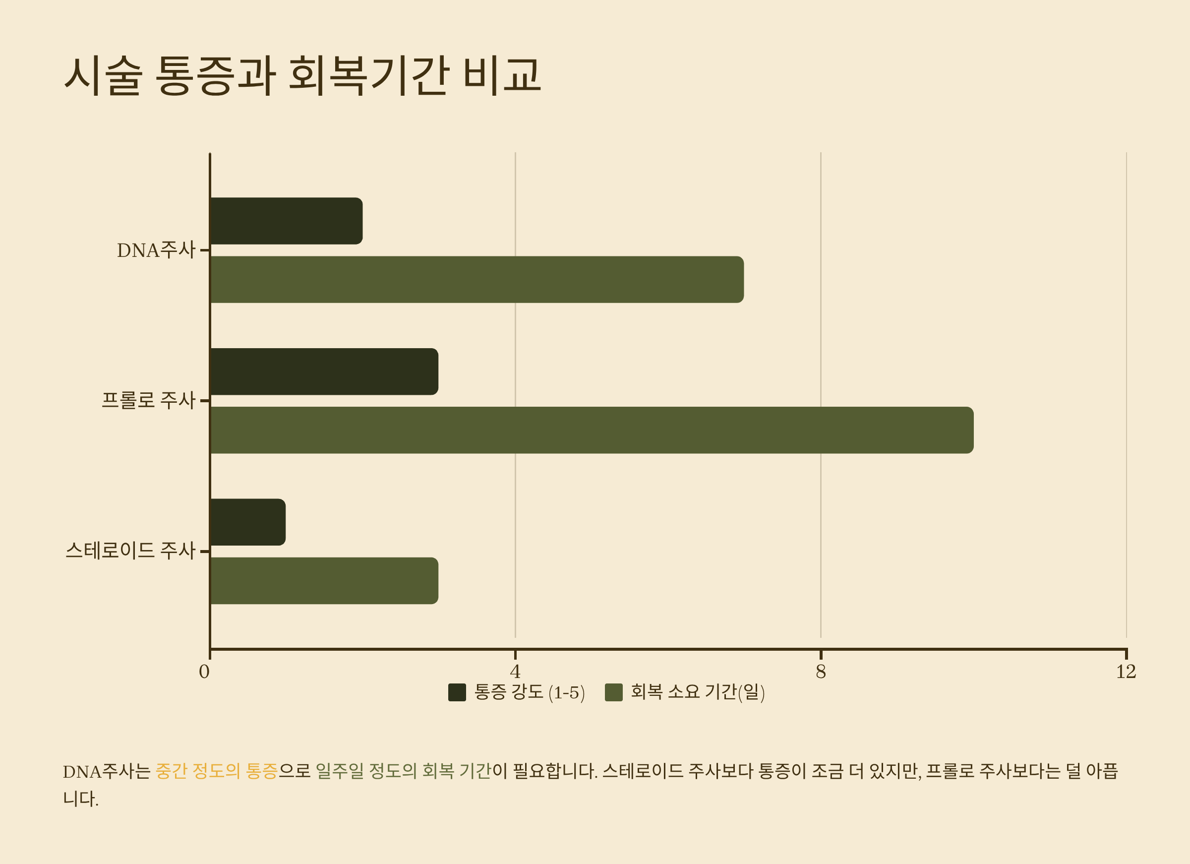 - 프롤로 주사: 인위적 염증 유도로 재생 유도, 통증 다소 강함