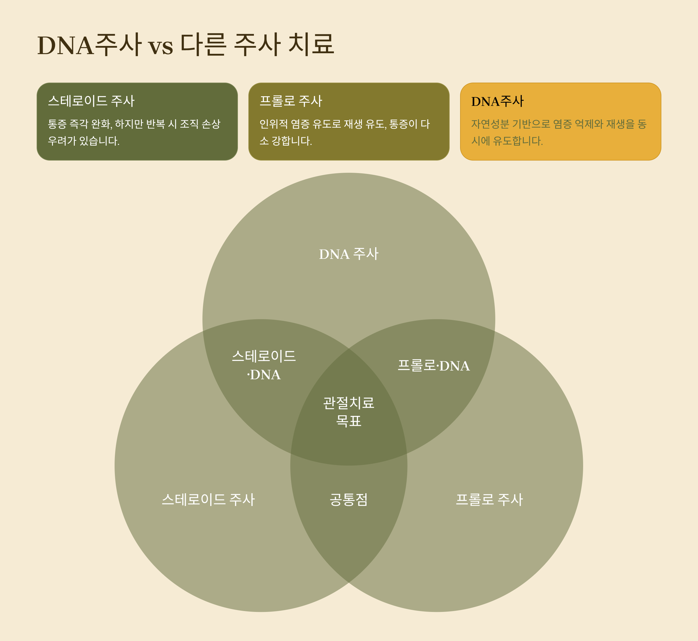 - DNA주사: 자연성분 기반으로 염증 억제 + 재생 동시 유도