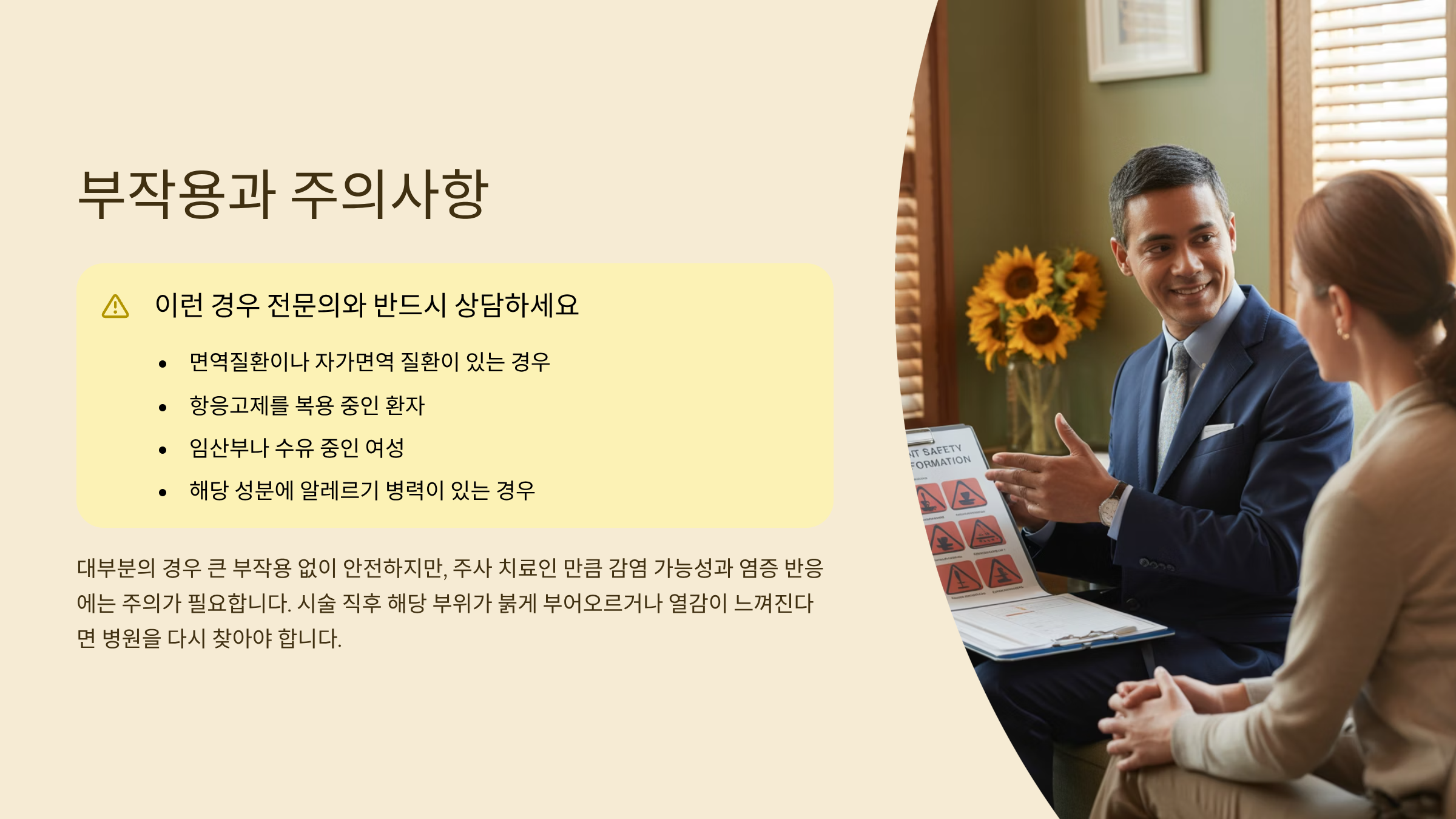 대부분의 경우 큰 부작용 없이 안전하지만, 주사 치료인 만큼 감염 가능성과 염증 반응에는 주의가 필요해요. 시술 직후 해당 부위가 붉게 부어오르거나 열감이 느껴진다면 병원을 다시 찾아야 합니다. 특히 아래와 같은 경우는 전문의와 반드시 상담 후 결정하세요.