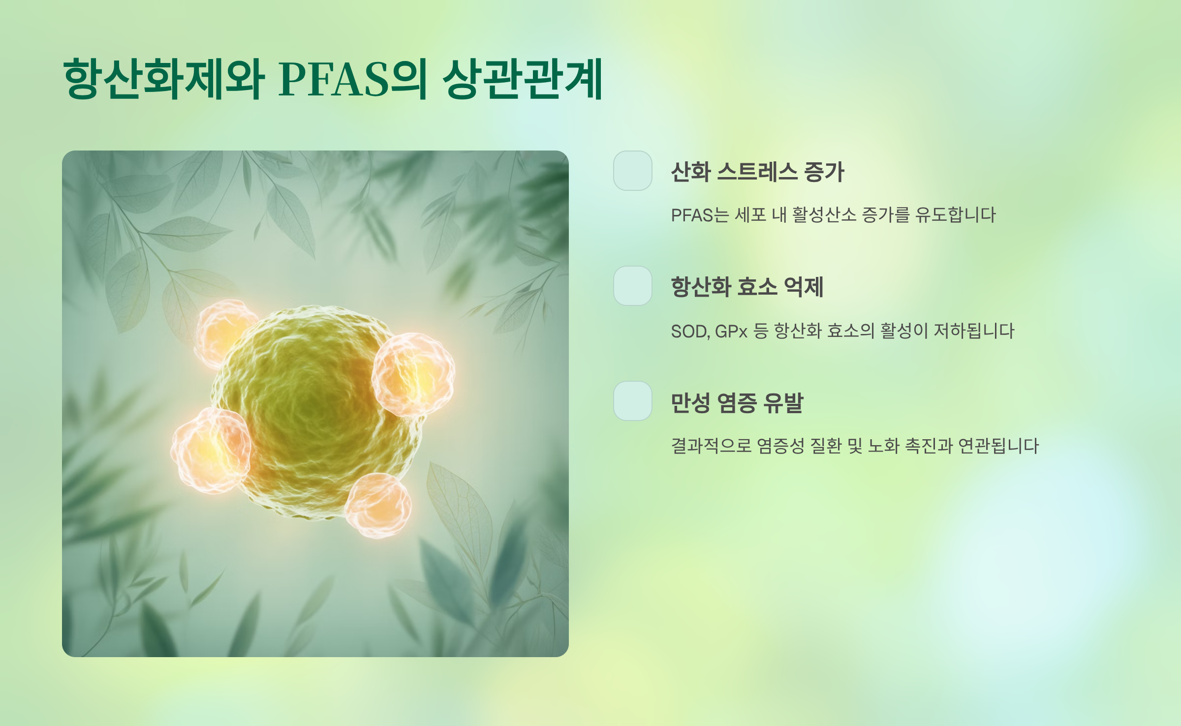 항산화제는 PFAS로 인해 증가하는 활성산소를 제거해 세포 손상을 줄이는 데 도움을 줄 수 있어요.