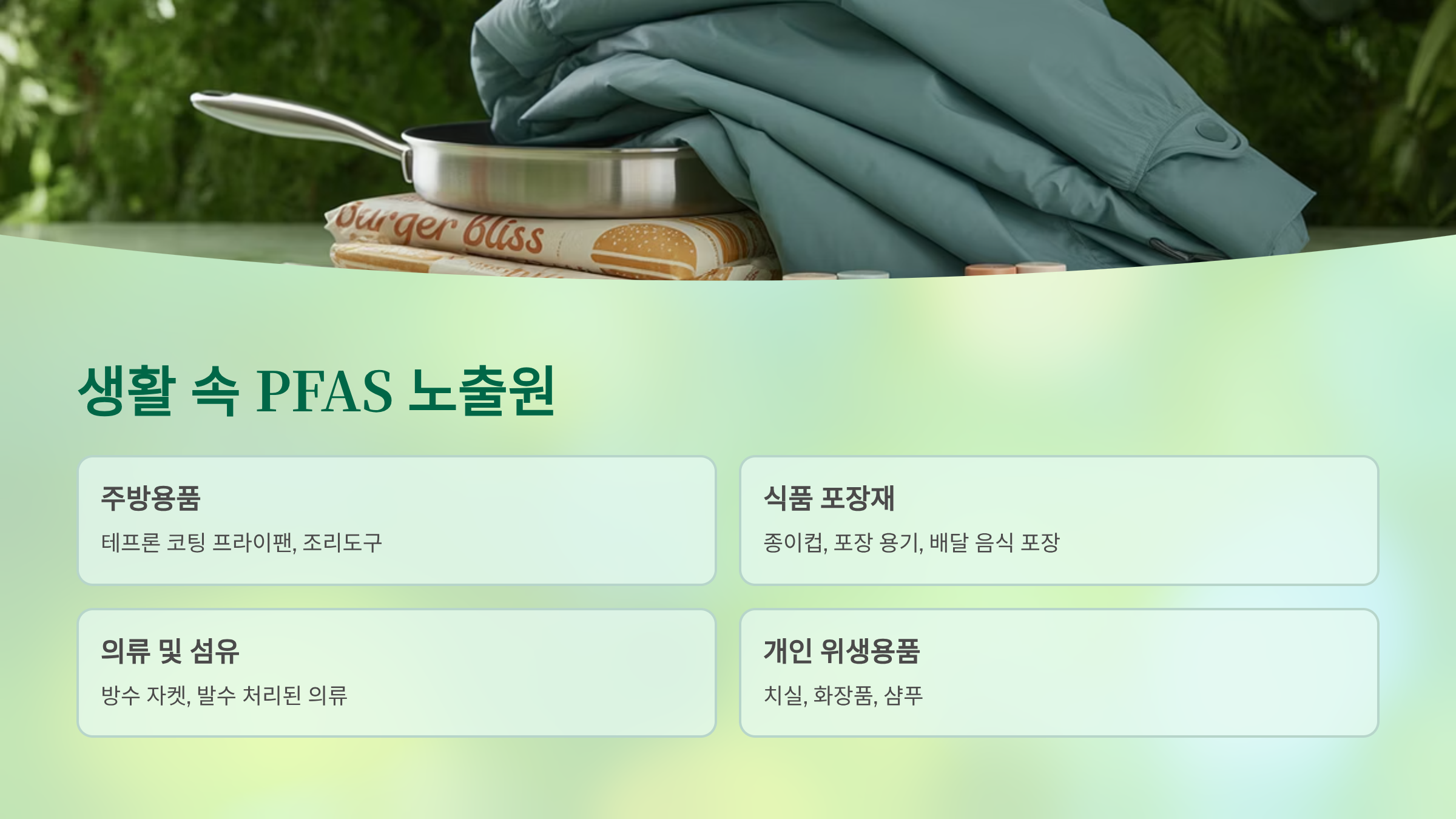방수 옷, 테프론 코팅 팬, 종이컵, 치실, 화장품, 심지어는 포장 용기까지도 PFAS를 포함할 수 있어요.