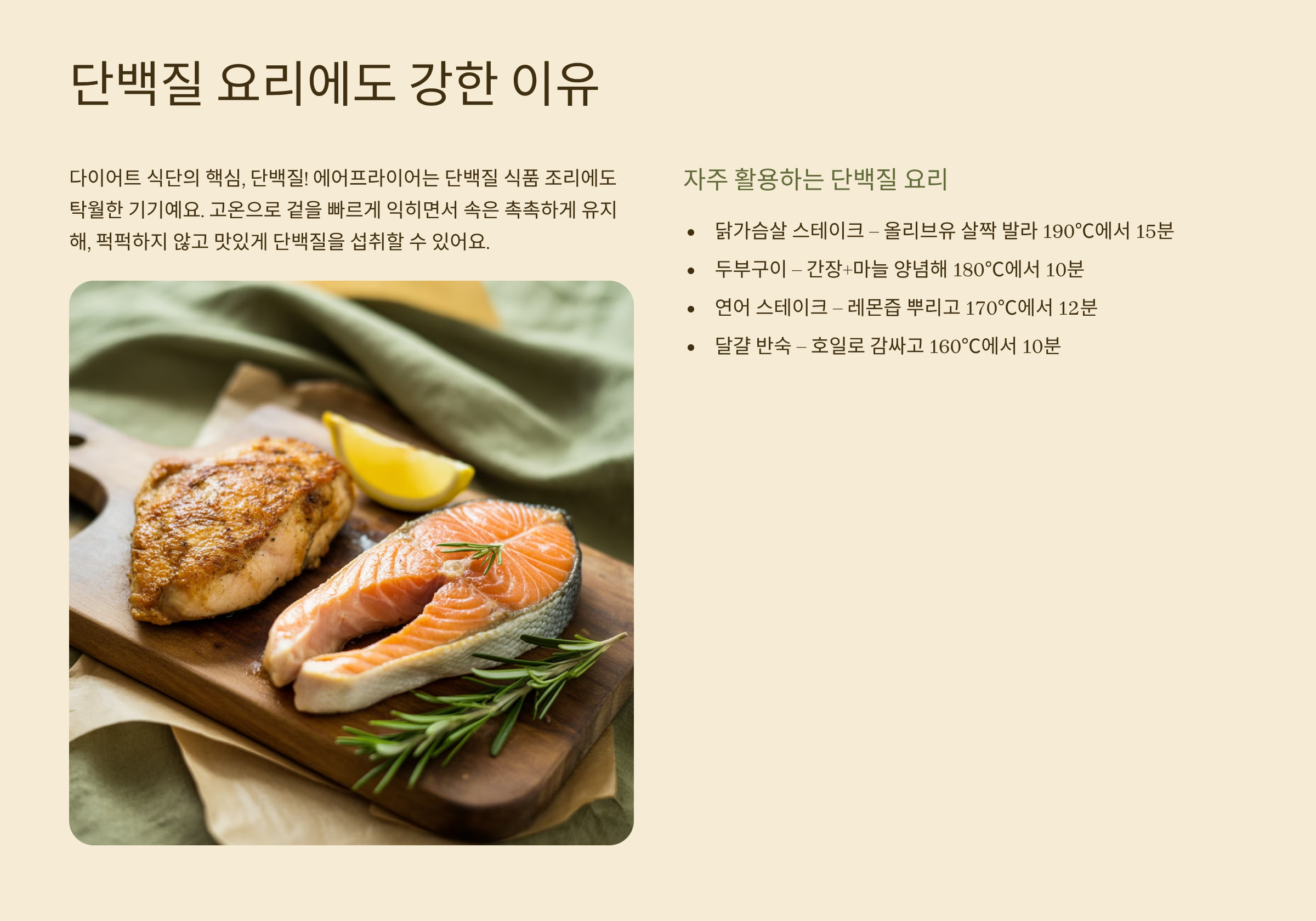 다이어트 식단의 핵심, 단백질! 에어프라이어는 단백질 식품 조리에도 탁월한 기기예요. 고온으로 겉을 빠르게 익히면서 속은 촉촉하게 유지해, 퍽퍽하지 않고 맛있게 단백질을 섭취할 수 있어요. 아래는 제가 자주 활용하는 단백질 요리 리스트예요.