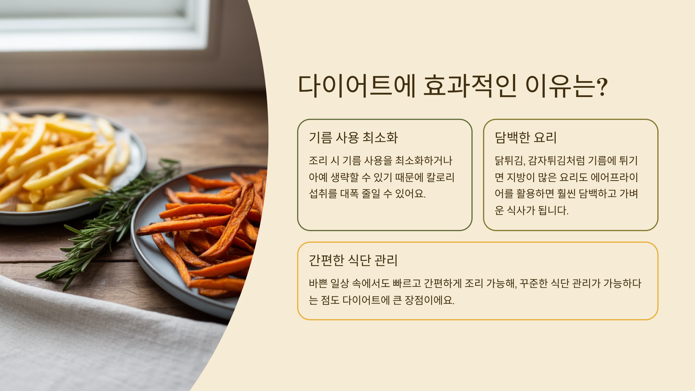 에어프라이어는 조리 시 기름 사용을 최소화하거나 아예 생략할 수 있기 때문에 칼로리 섭취를 대폭 줄일 수 있어요. 특히 닭튀김, 감자튀김처럼 기름에 튀기면 지방이 많은 요리도 에어프라이어를 활용하면 훨씬 담백하고 가벼운 식사가 됩니다. 무엇보다 바쁜 일상 속에서도 빠르고 간편하게 조리 가능해, 꾸준한 식단 관리가 가능하다는 점도 다이어트에 큰 장점이에요.