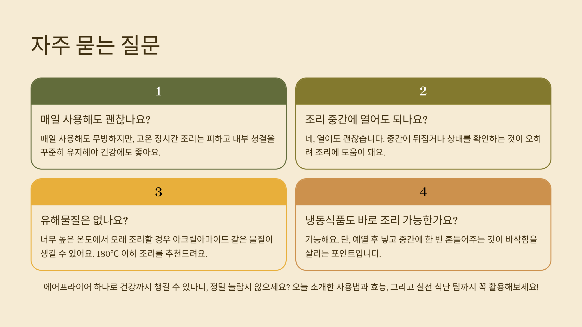 에어프라이어 하나로 건강까지 챙길 수 있다니, 정말 놀랍지 않으세요? 저도 예전엔 튀김기 정도로만 생각했는데, 어느새 저희 집 식단의 핵심 기기가 되어버렸어요. 다이어트를 고민하시는 분들, 심혈관 건강에 관심이 있는 분들께도 꼭 추천하고 싶은 도구랍니다. 오늘 소개한 5가지 사용법과 효능, 그리고 실전 식단 팁까지 꼭 활용해보세요. 여러분만의 건강 레시피가 있다면 댓글로 공유해주시는 것도 잊지 마세요!