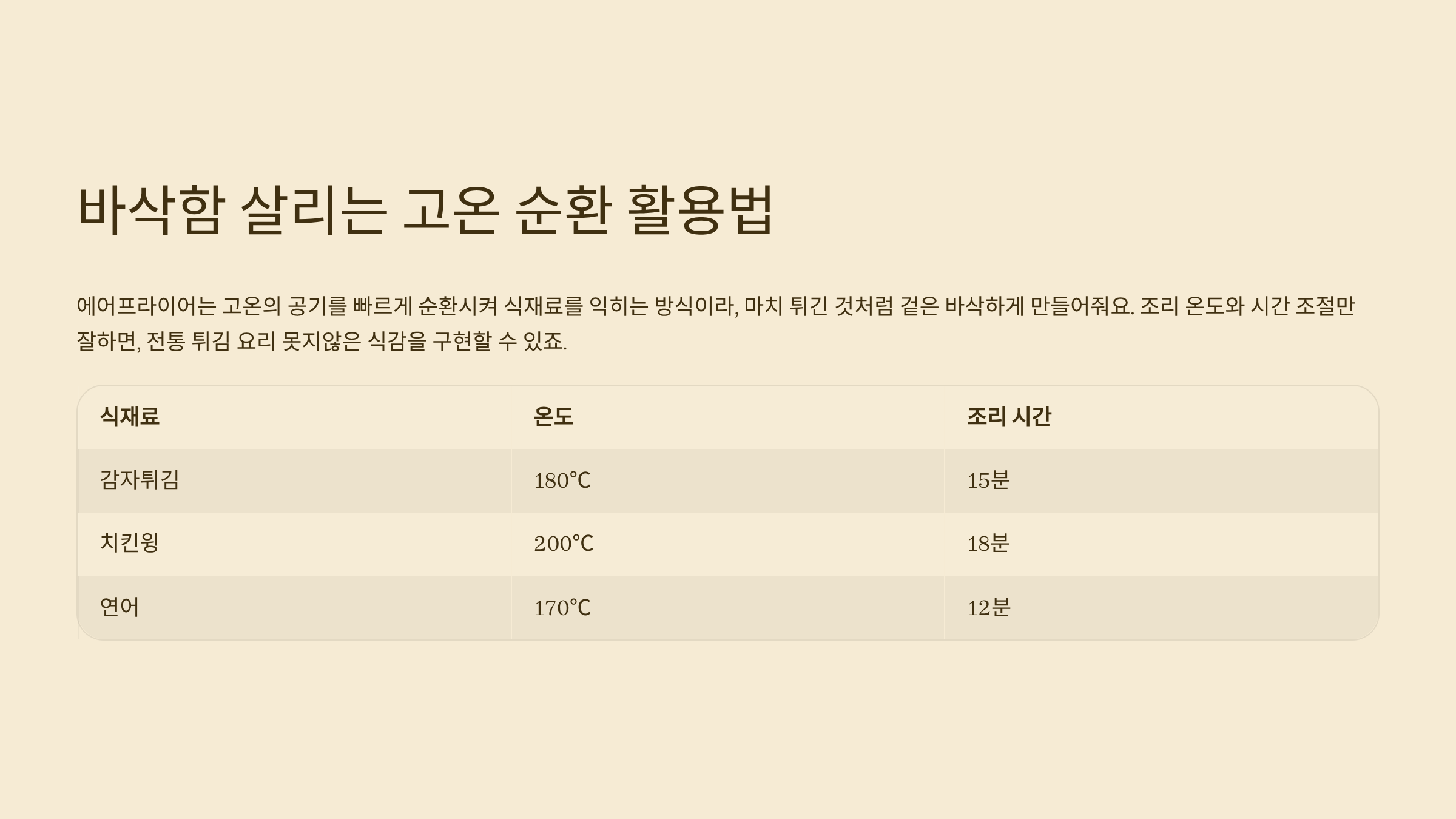 에어프라이어는 고온의 공기를 빠르게 순환시켜 식재료를 익히는 방식이라, 마치 튀긴 것처럼 겉은 바삭하게 만들어줘요. 조리 온도와 시간 조절만 잘하면, 전통 튀김 요리 못지않은 식감을 구현할 수 있죠. 아래 표는 대표적인 식재료별 추천 온도와 시간을 정리한 내용이에요.