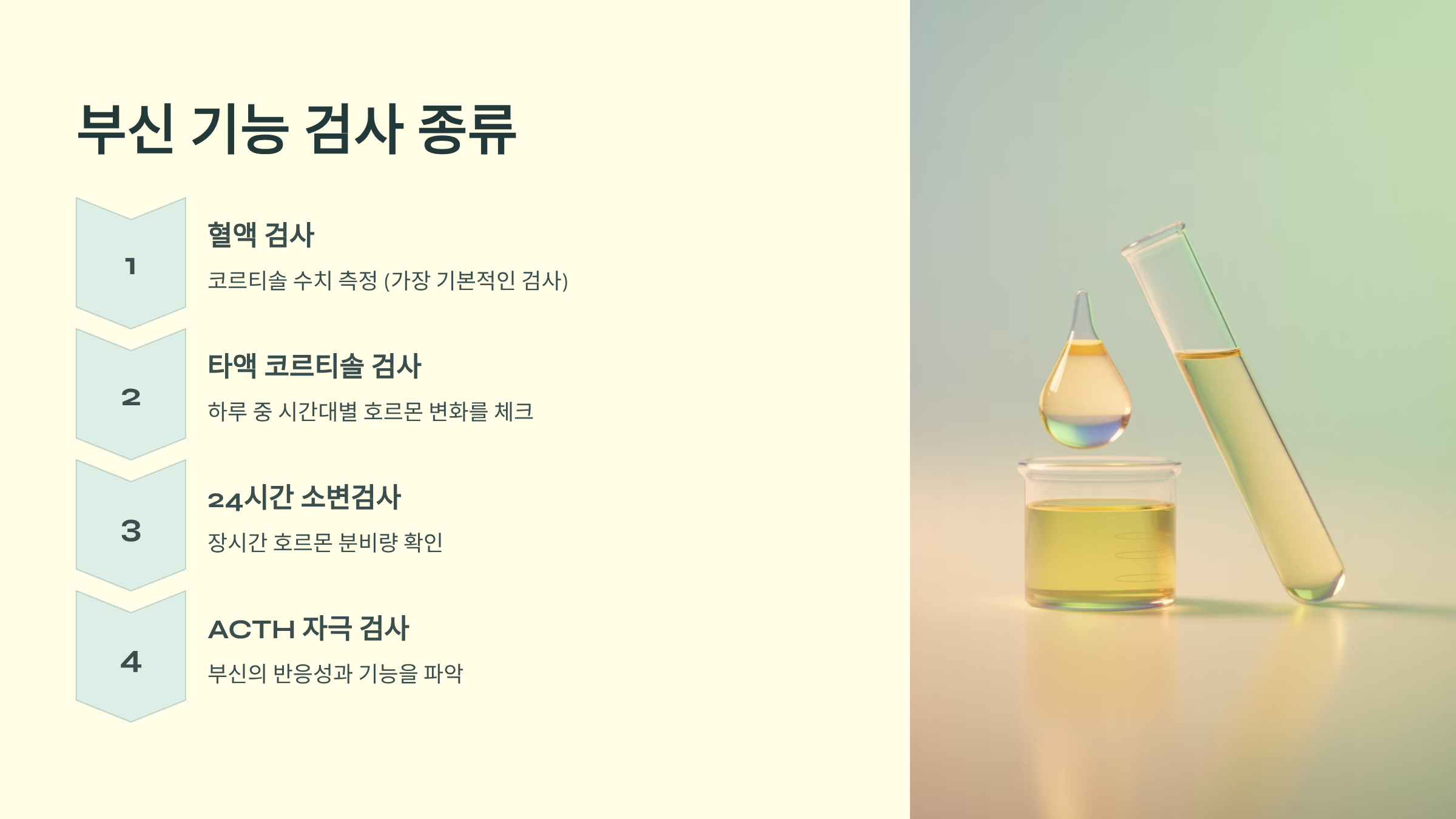 부신 기능이 의심될 경우, 병원에서 다양한 검사를 통해 상태를 확인할 수 있어요. 가장 흔한 검사는 혈액 검사를 통한 코르티솔 수치 측정입니다. 이 외에도 타액 코르티솔 검사, 24시간 소변검사, ACTH 자극 검사 등 다양한 방식으로 부신의 반응성과 기능을 파악할 수 있죠. 특히