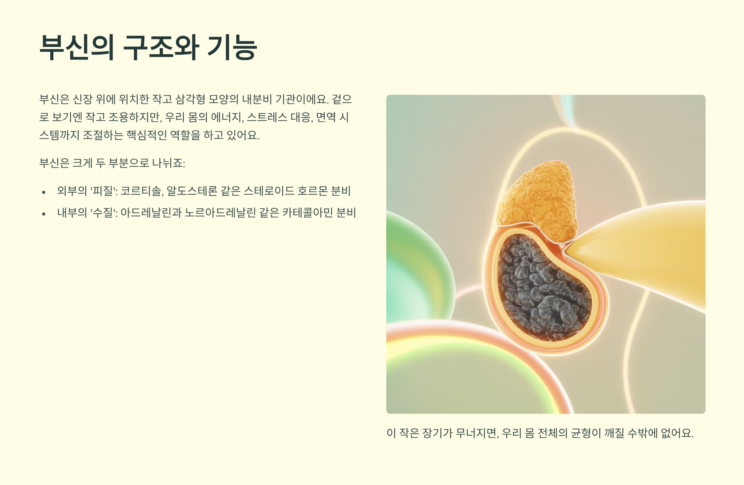 안녕하세요, 요즘 건강에 관한 관심이 폭발적으로 늘고 있죠. 저 역시 건강검진에서 '코르티솔 수치가 조금 높다'는 소견을 듣고 처음으로 '부신'이라는 존재를 제대로 알게 되었어요. 평소엔 전혀 신경 쓰지 않던 장기인데, 알고 보니 피로, 우울감, 면역력까지 전부 이 작은 기관과 연결되어 있더라고요. 그래서 오늘은 부신이 뭔지, 어떤 역할을 하는지, 그리고 우리가 어떻게 관리하면 좋은지를 낱낱이 파헤쳐보려 합니다. 여러분의 건강, 정말 중요한 이야기니까요!