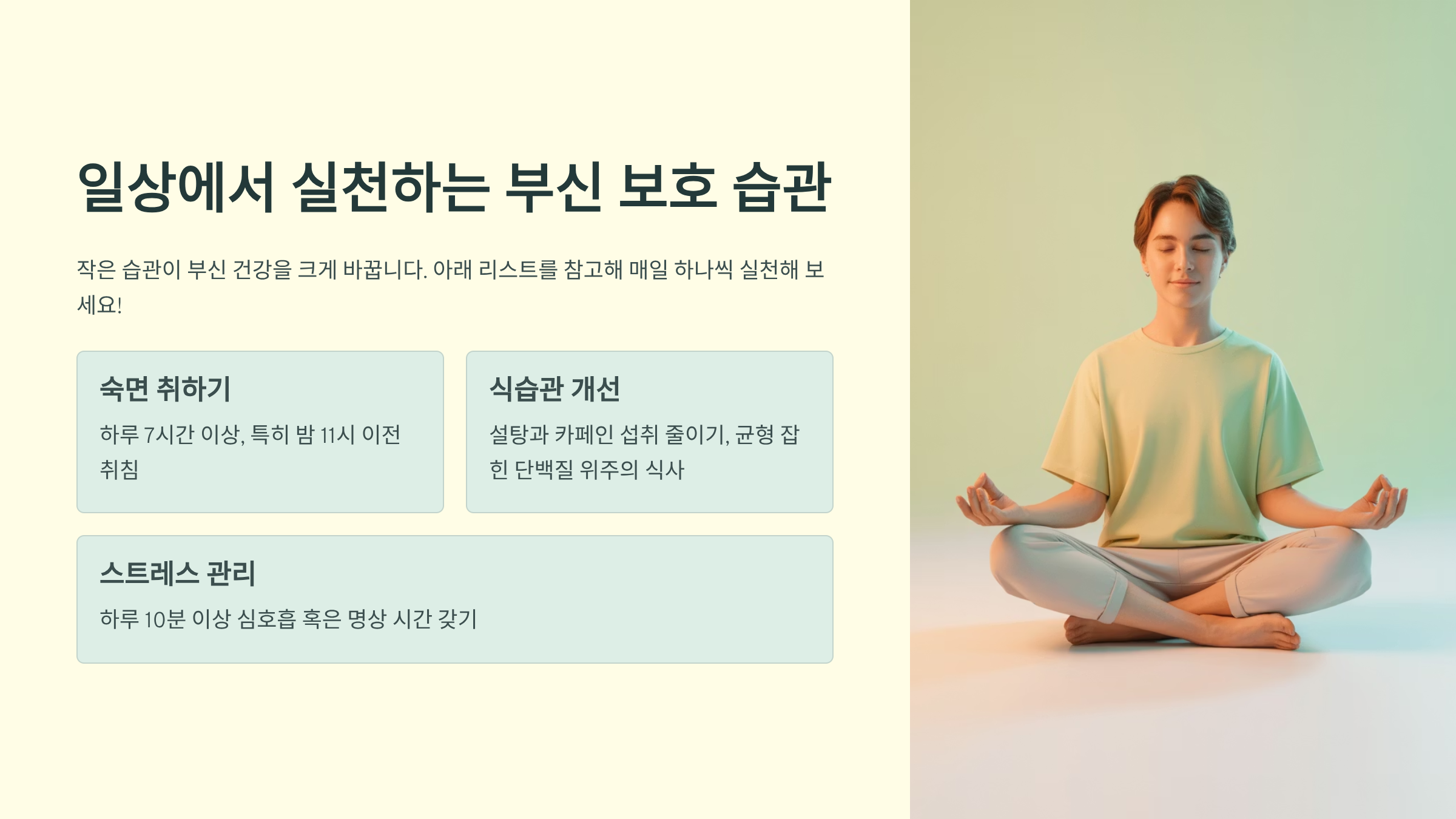 작은 습관이 부신 건강을 크게 바꿉니다. 아래 리스트를 참고해 매일 하나씩 실천해 보세요!
