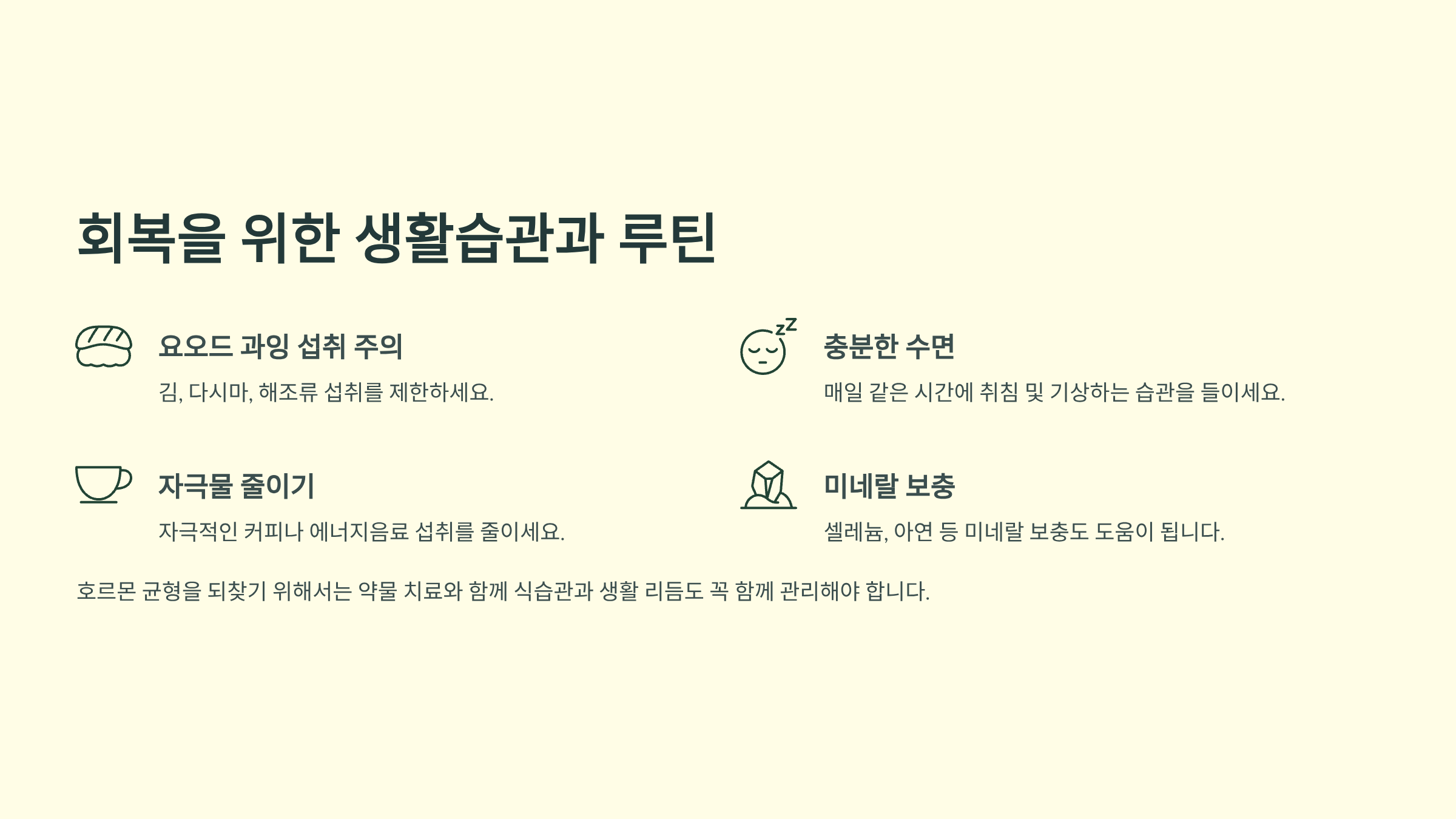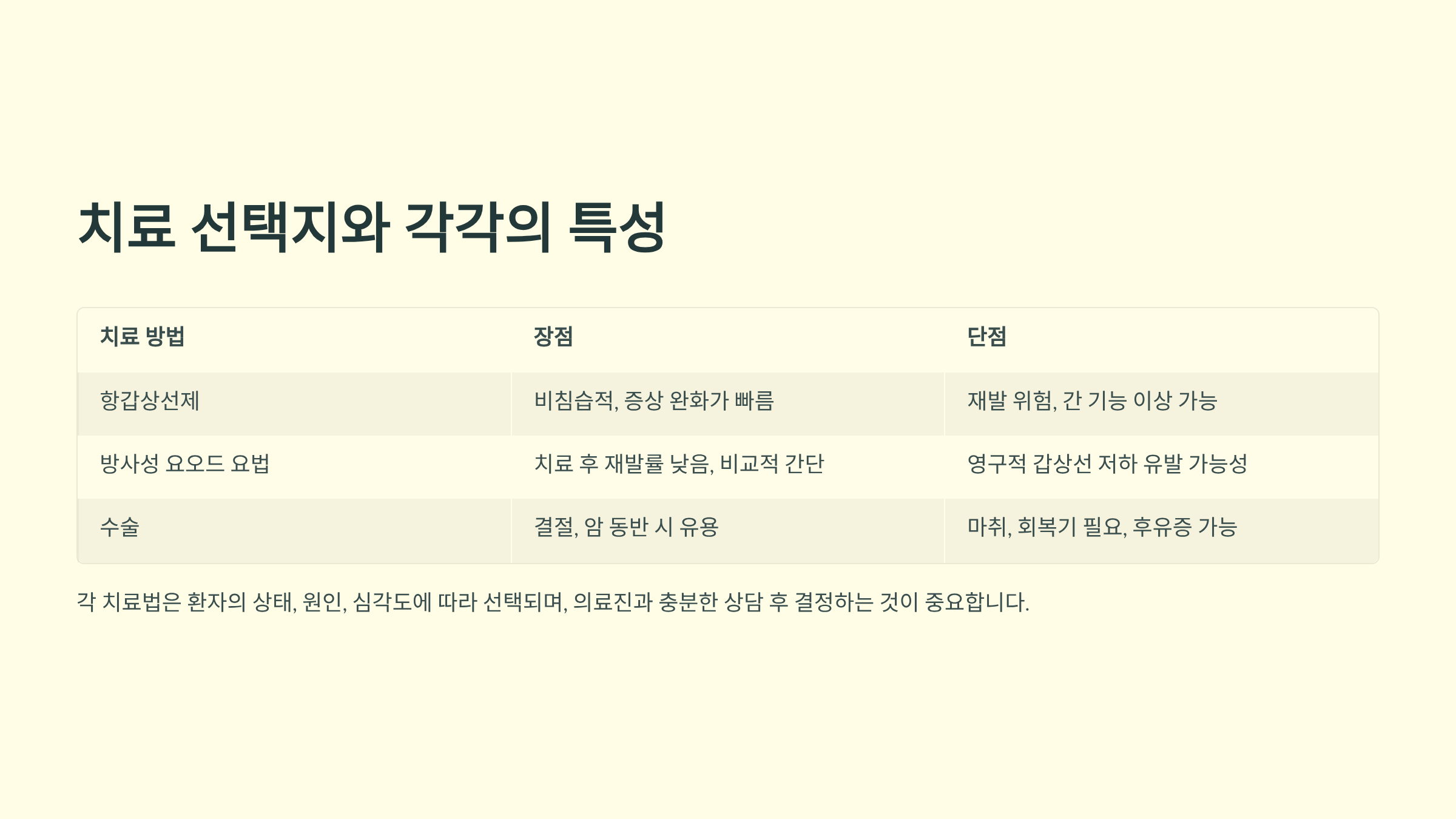 | 항갑상선제 | 비침습적, 증상 완화가 빠름 | 재발 위험, 간 기능 이상 가능 |
