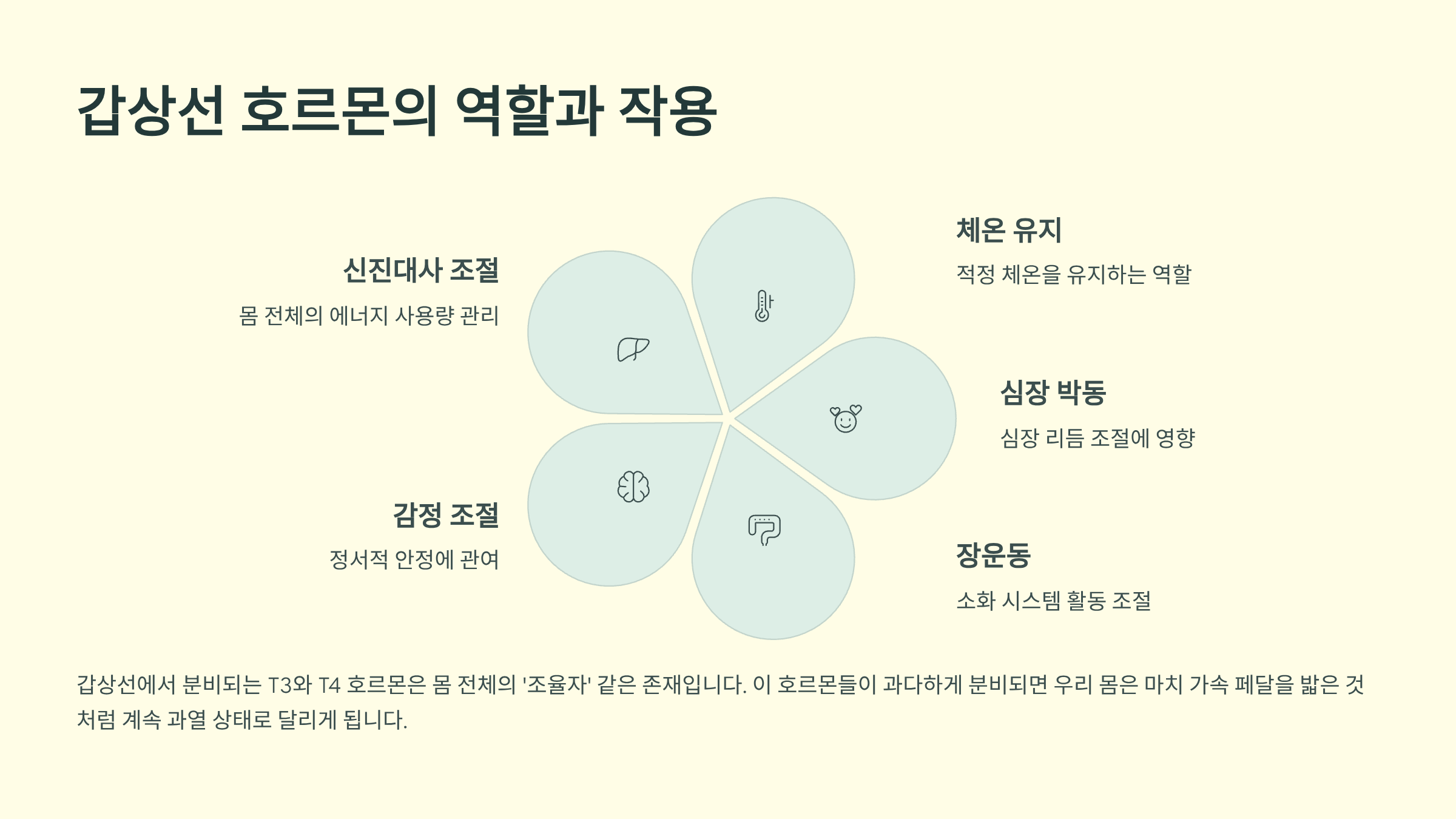갑상선에서 분비되는 T3와 T4 호르몬은 단순한 신진대사 조절을 넘어서 몸 전체의 에너지 사용량, 체온 유지, 심장 박동, 장운동, 감정 조절에까지 영향을 미치는 '조율자' 같은 존재예요. 이 호르몬들이 과다하게 분비되면 우리 몸은 마치 가속 페달을 밟은 것처럼 계속 과열 상태로 달리게 됩니다. 이로 인해 피로는 오히려 심해지고, 무기력한 에너지가 동반되죠. 결국, 갑상선의 리듬이 깨지면 몸 전체의 균형도 흔들릴 수밖에 없답니다.