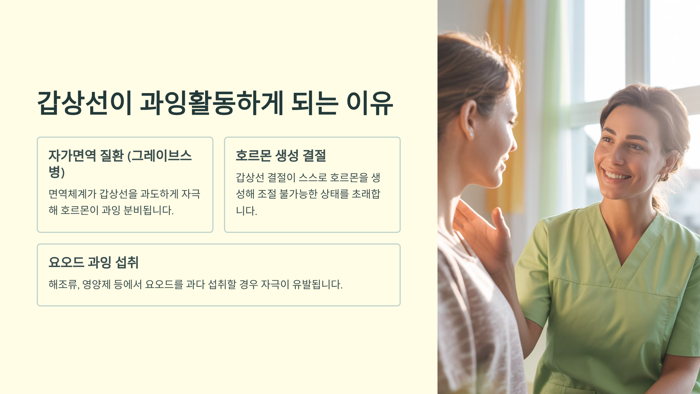 | 자가면역 질환(그레이브스병) | 면역체계가 갑상선을 과도하게 자극해 호르몬이 과잉 분비됨 |