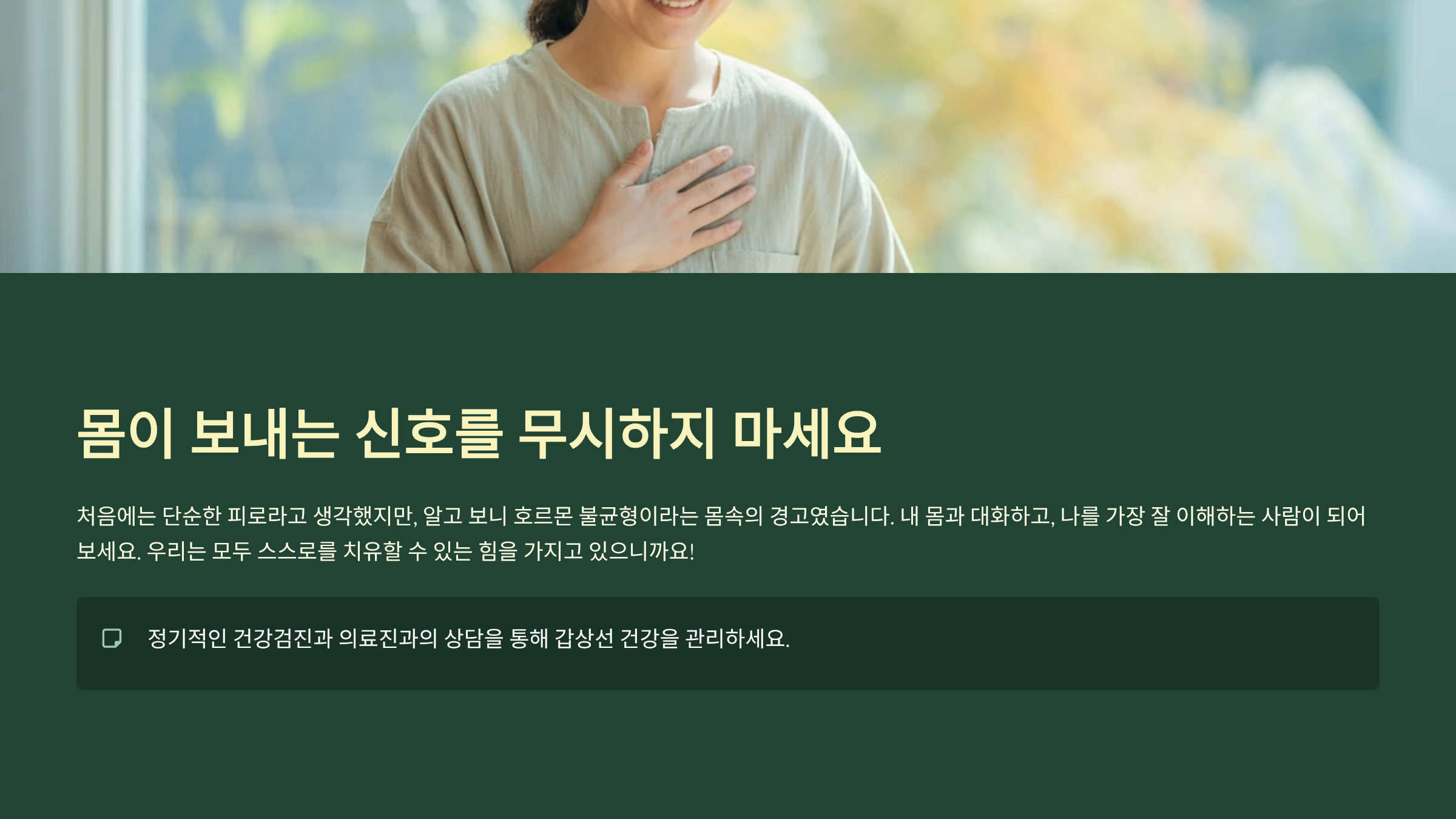 몸이 보내는 신호를 무시하지 않는 것, 그것이 진짜 건강의 시작이에요. 저도 처음에는 단순한 피로라고 생각했지만, 알고 보니 호르몬 불균형이라는 몸속의 경고였더라고요. 오늘 이 글이 여러분에게 작은 자각의 계기가 되었길 바라요. 언제나처럼 내 몸과 대화하고, 나를 가장 잘 이해하는 사람이 되어보세요. 우리는 모두 스스로를 치유할 수 있는 힘을 가지고 있으니까요!