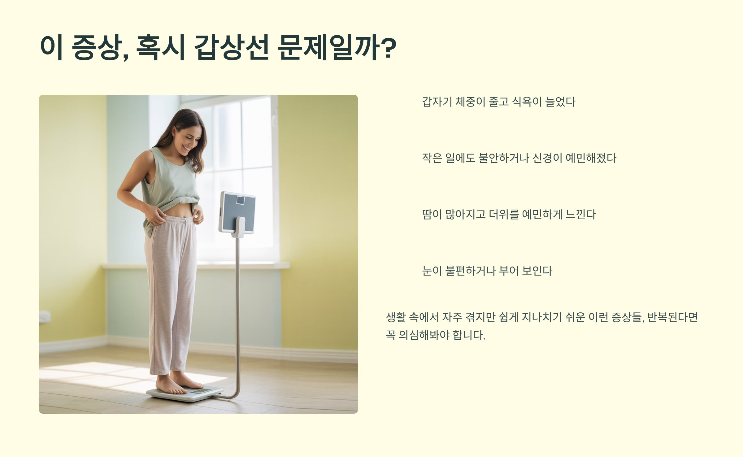 안녕하세요. 어느 날부터인가 사소한 일에도 숨이 차고, 식욕은 그대로인데 체중은 줄고, 감정도 롤러코스터처럼 흔들리는 경험, 혹시 해보셨나요? 저 역시 그런 변화가 반복되며 '이게 뭐지?' 싶었는데, 결국 갑상선항진증이라는 진단을 받았죠. 그 이후 저는 내 몸의 리듬을 되찾기 위해 공부하고, 식습관부터 수면까지 모든 걸 재정비했어요. 오늘 이 글을 통해 여러분도 갑상선과 호르몬의 숨은 비밀을 제대로 알고, 스스로의 건강을 지키는 힘을 얻어가셨으면 좋겠어요!