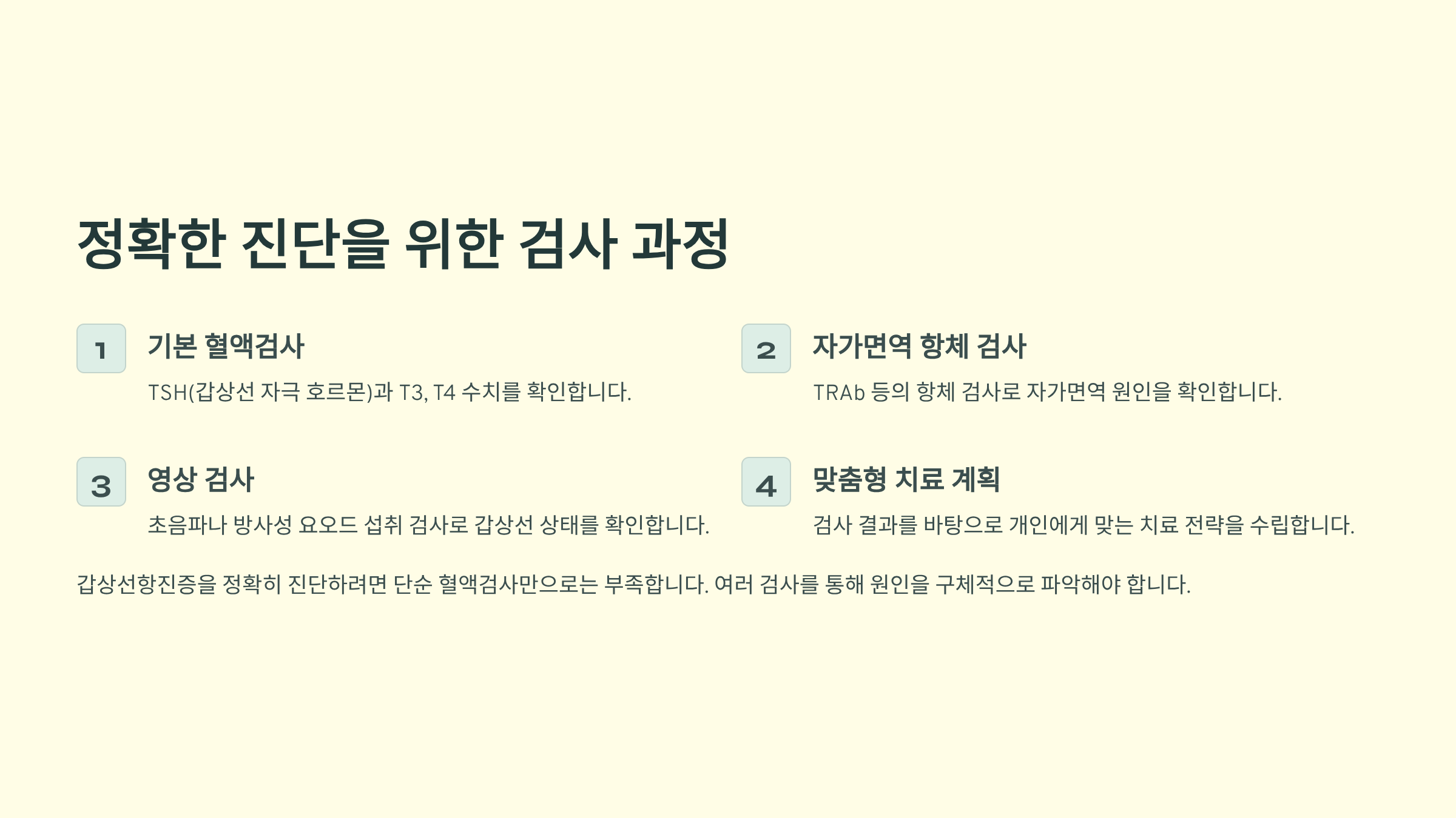 갑상선항진증을 정확히 진단하려면 단순 혈액검사만으로는 부족해요. 먼저 TSH(갑상선 자극 호르몬)과 T3, T4 수치를 확인한 뒤, 자가면역 항체 검사(TRAb 등)나 초음파, 방사성 요오드 섭취 검사가 함께 이루어지기도 합니다. 이런 과정을 통해 원인을 구체적으로 파악하고, 맞춤형 치료 전략을 수립할 수 있어요.