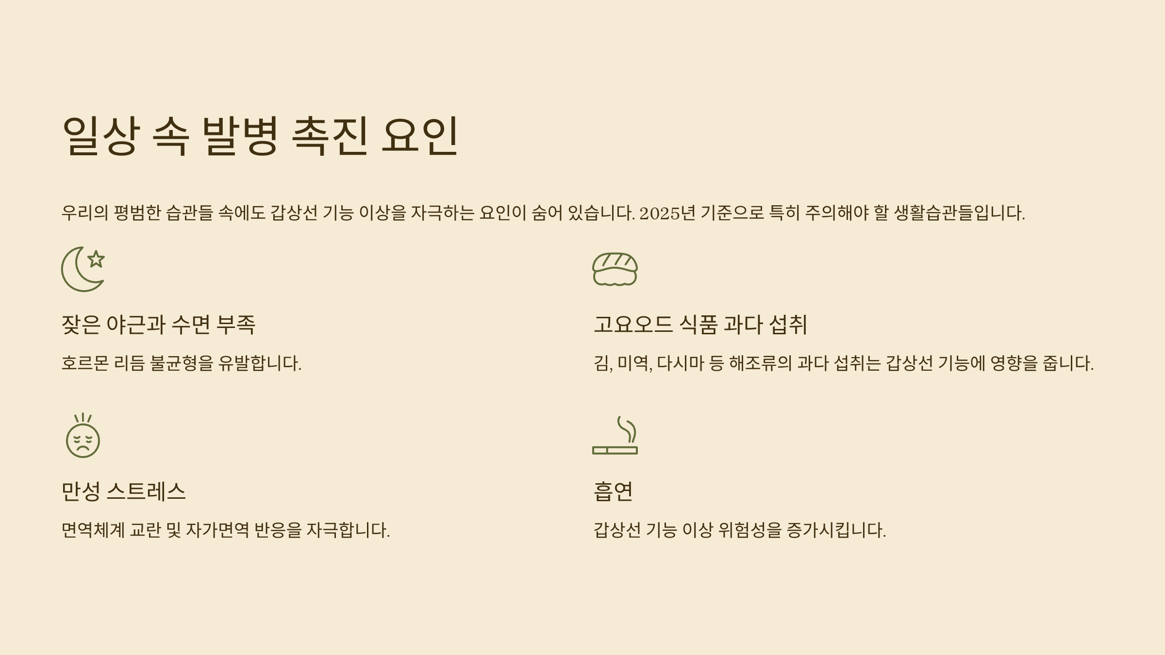 우리의 평범한 습관들 속에도 갑상선 기능 이상을 자극하는 요인이 숨어 있어요. 아래 항목은 2025년 기준으로 특히 주의해야 할 생활습관들입니다.