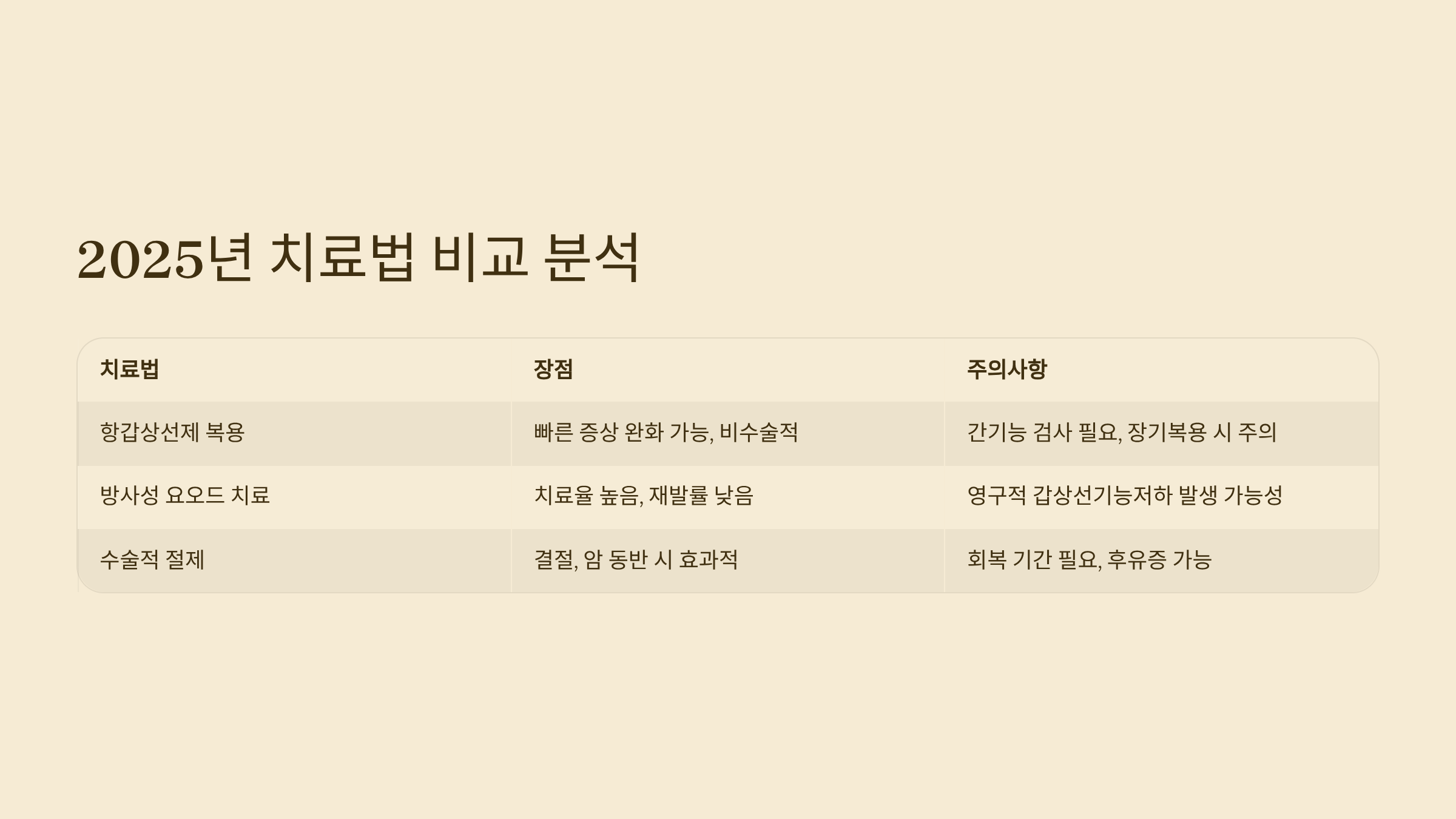 | 항갑상선제 복용 | 빠른 증상 완화 가능, 비수술적 | 간기능 검사 필요, 장기복용 시 주의 |