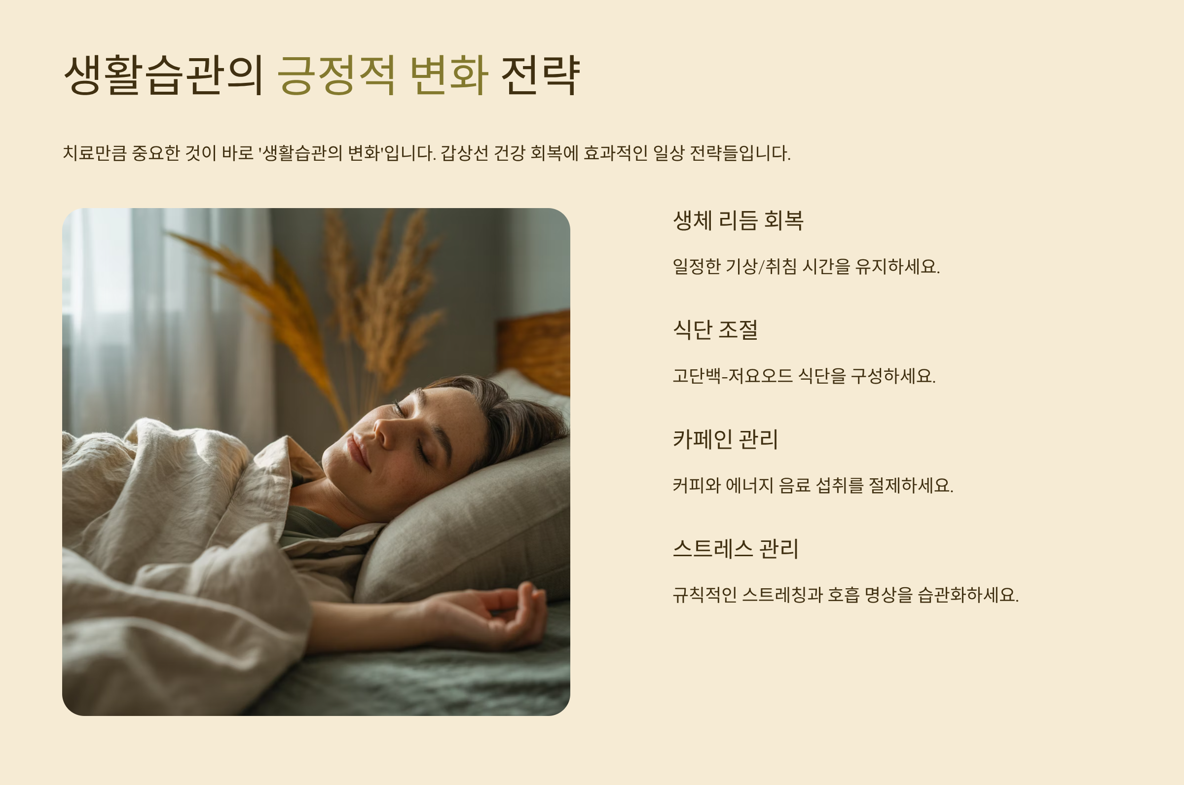 치료만큼 중요한 것이 바로 ‘생활습관의 변화’입니다. 아래는 갑상선 건강 회복에 효과적인 일상 전략들이에요.