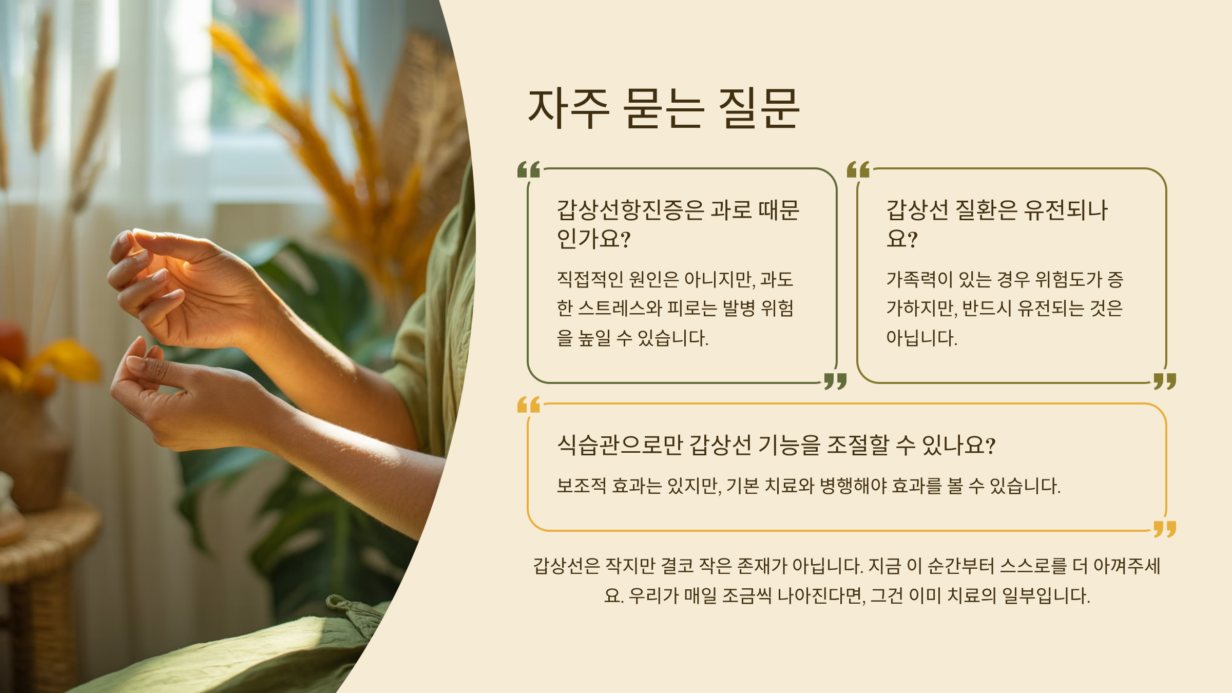 갑상선은 작지만 결코 작은 존재가 아니에요. 피곤함이나 체중 변화 같은 익숙한 증상들이 사실은 내 몸의 구조적인 신호일 수 있다는 것, 오늘 포스팅을 통해 새롭게 느끼셨다면 그것만으로도 큰 변화의 시작일 거예요. 저도 건강을 되찾기 위해 하나씩 습관을 고치며 지금까지 살아왔고, 여러분도 충분히 해낼 수 있어요. 지금 이 순간부터 스스로를 더 아껴주기로 해요. 우리가 매일 조금씩 나아진다면, 그건 이미 치료의 일부니까요.
