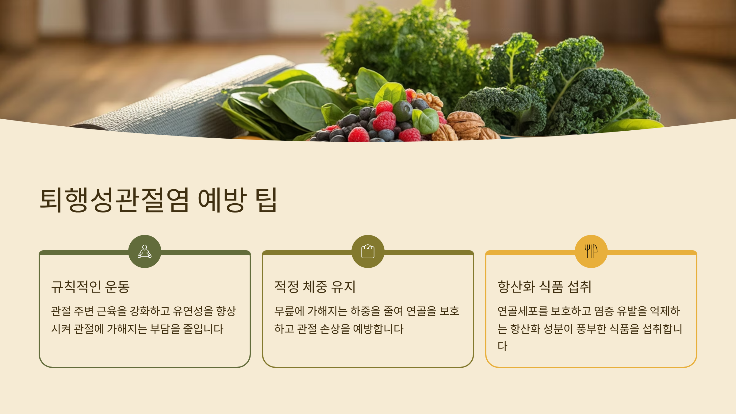 | 항산화 식품 섭취 | 연골세포 보호, 염증 유발 억제 |