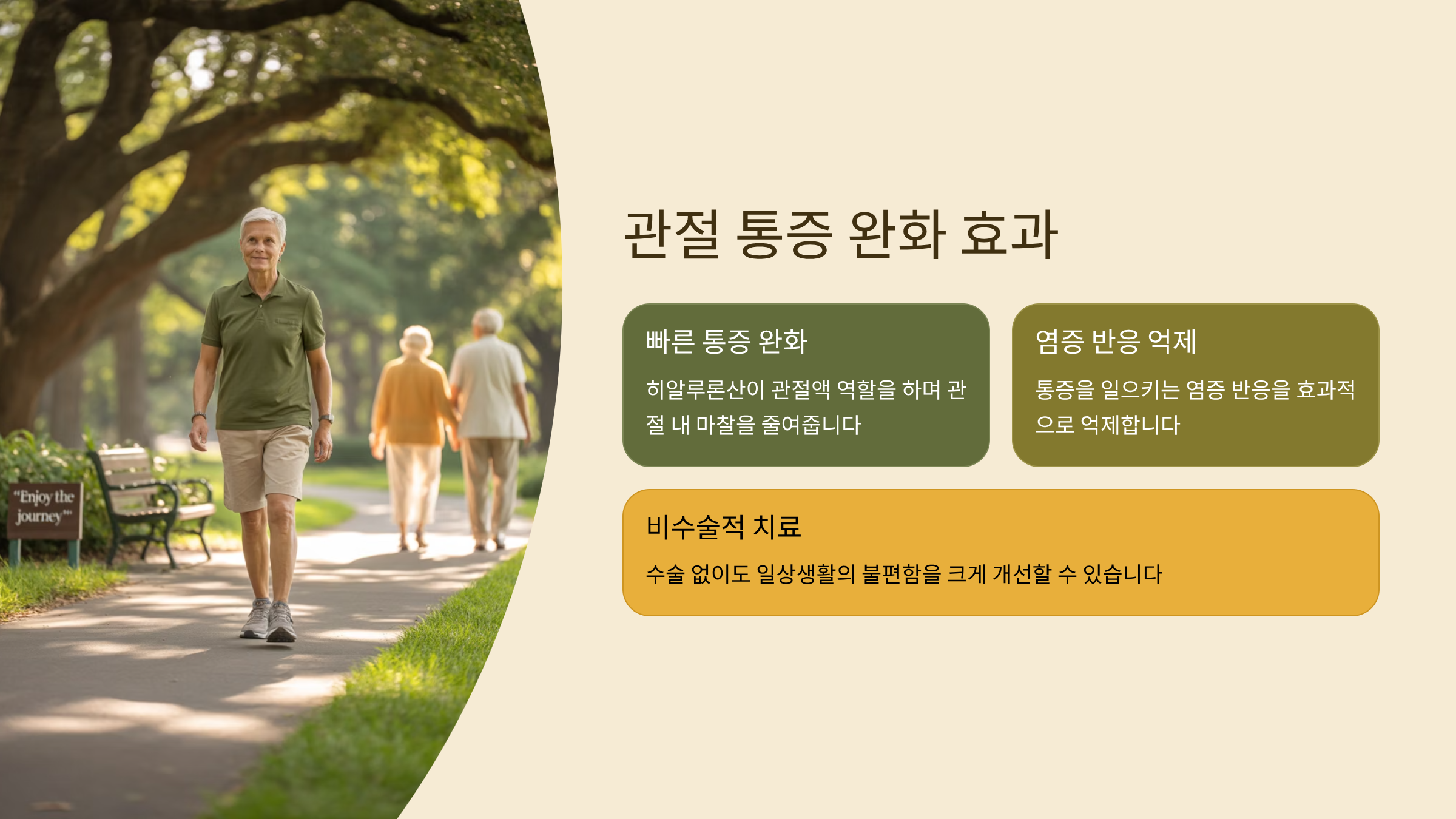 무릎연골주사의 가장 큰 장점 중 하나는 빠른 통증 완화입니다. 히알루론산이 관절액 역할을 하며 관절 내 마찰을 줄이고, 통증을 일으키는 염증 반응을 억제하는 효과가 있어요. 수술 없이도 일상생활에 큰 지장을 줄 수 있는 무릎 통증을 개선할 수 있어 많은 환자들이 찾고 있는 치료법입니다.