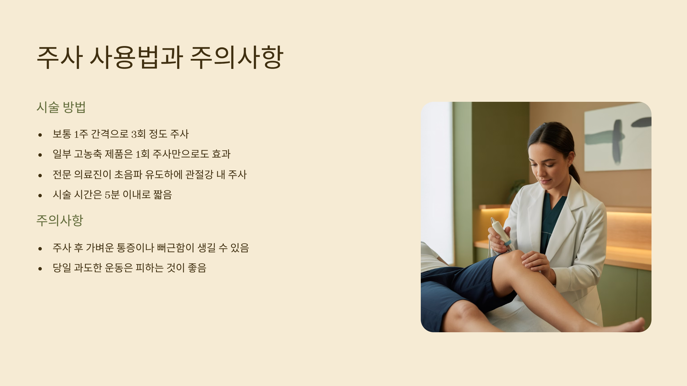 무릎연골주사는 보통 1주 간격으로 3회 정도 맞으며, 일부 고농축 제품은 1회 주사만으로도 효과를 낼 수 있어요. 전문 의료진이 초음파 유도하에 관절강 내에 주사하며, 시술 시간은 5분 이내로 짧습니다. 주사 후에는 가벼운 통증이나 뻐근함이 생길 수 있으니, 당일 과도한 운동은 피하는 것이 좋습니다.