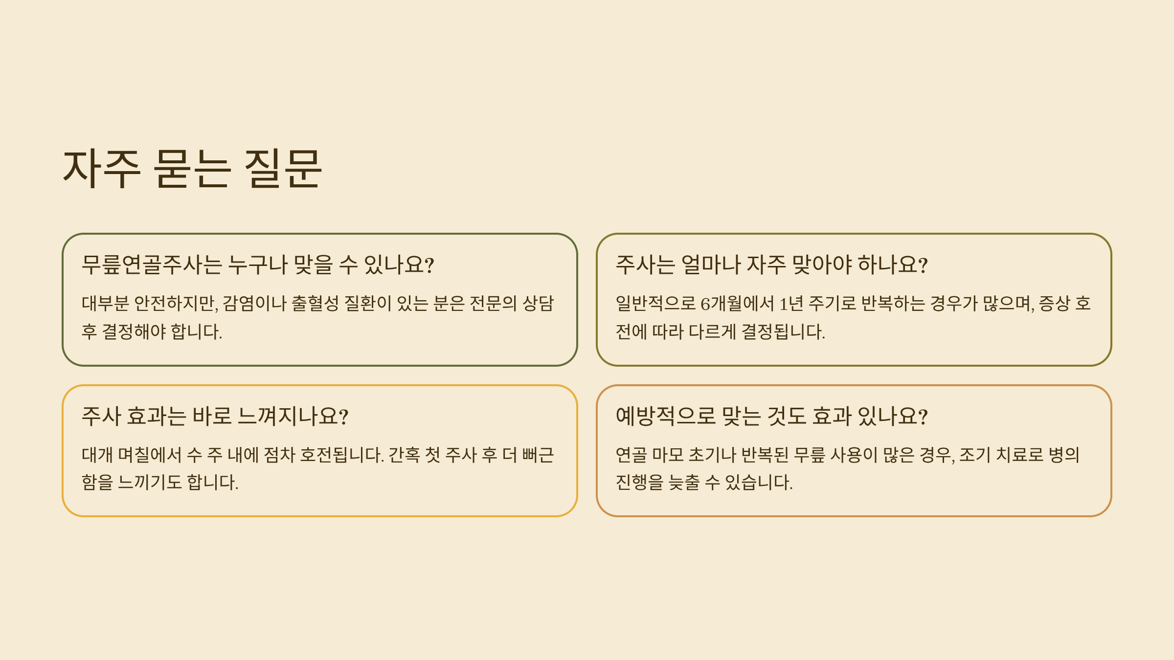 대개 며칠에서 수 주 내에 점차 호전됩니다. 간혹 첫 주사 후 더 뻐근함을 느끼기도 해요.