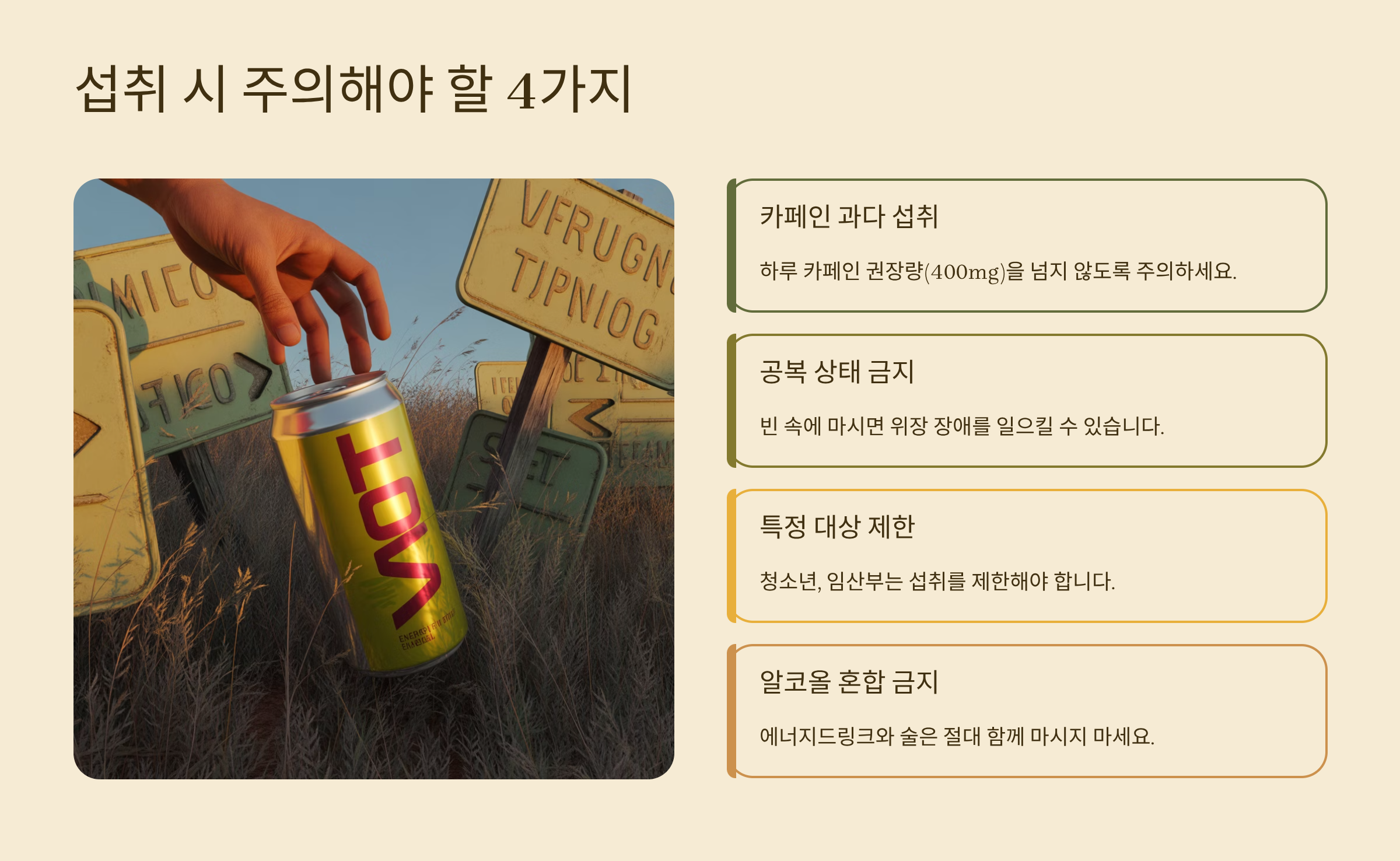 에너지드링크가 익숙해질수록 자칫 잘못된 습관으로 이어질 수 있어요. 다음 4가지 주의사항을 꼭 기억해주세요.
