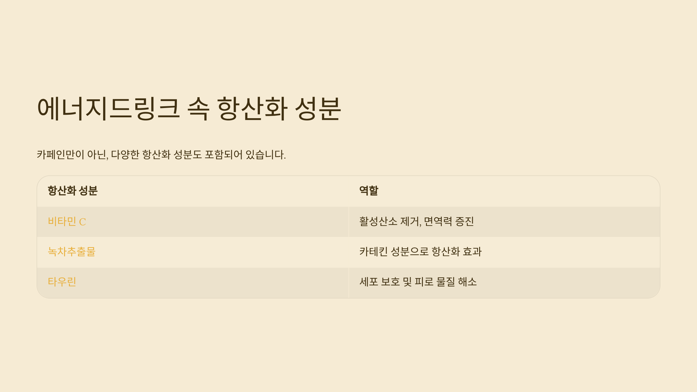 안녕하세요! 바쁜 업무에 쫓겨 정신없이 일하다 보면 ‘딱 한 캔만!’ 하고 에너지드링크를 손에 들 때가 많죠. 저도 그랬어요. 그런데 점점 습관처럼 마시게 되면서, 이게 몸에 어떤 영향을 미치는 걸까 궁금해지더라고요. 특히 카페인은 익숙하지만, 항산화 성분까지 있다는 이야기를 듣고 본격적으로 알아보기 시작했답니다. 이번 글에서는 에너지드링크에 숨겨진 기능과 성분의 비밀, 건강하게 마시는 법까지 낱낱이 공개해드릴게요!