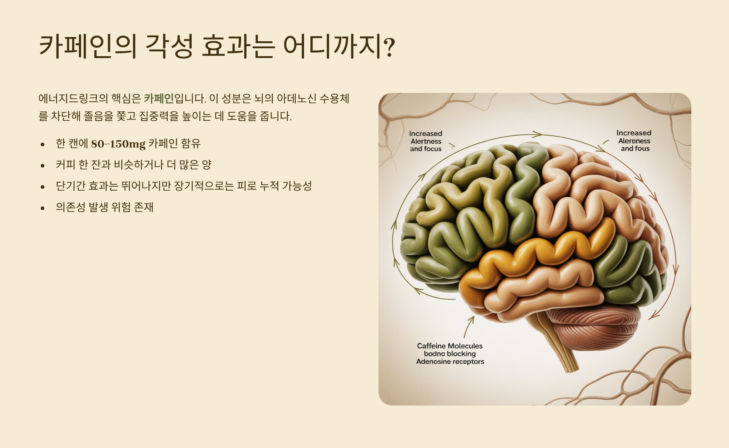 에너지드링크의 핵심은 단연 카페인이에요. 이 성분은 뇌의 아데노신 수용체를 차단해 졸음을 쫓고 집중력을 높이는 데 도움을 줍니다. 한 캔에 들어 있는 카페인은 80~150mg 수준으로 커피 한 잔과 비슷하거나 더 많을 수 있어요. 단기간 효과는 뛰어나지만, 장기적으로는 피로 누적이나 의존 가능성도 있다는 점을 유의해야 합니다.