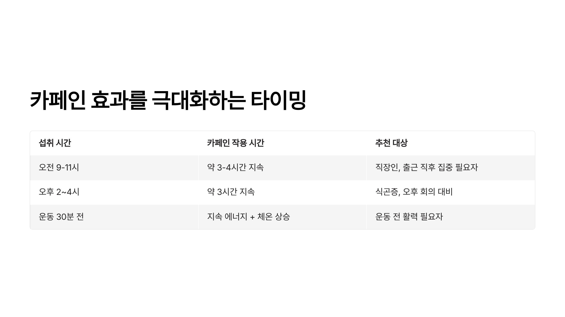 | 섭취 시간 | 카페인 작용 시간 | 추천 대상 |