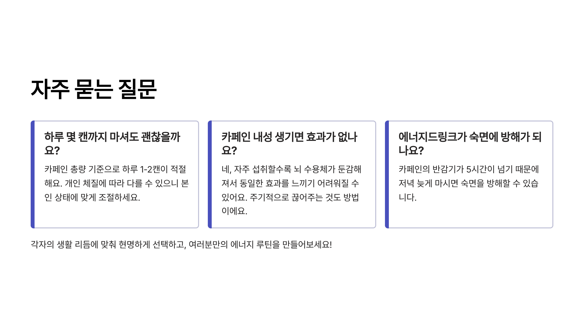 오늘은 2025년 최신 기준으로 에너지드링크와 카페인을 어떻게 활용하면 가장 효과적이고 건강하게 에너지를 충전할 수 있는지에 대해 알아봤습니다. 카페인도 적절히 활용하면 멋진 조력자가 될 수 있답니다. 각자의 생활 리듬에 맞춰 현명하게 선택하고, 여러분만의 에너지 루틴을 만들어보세요! 이 글이 도움이 되셨다면 댓글이나 공감으로 소통해주시면 큰 힘이 됩니다. 😊